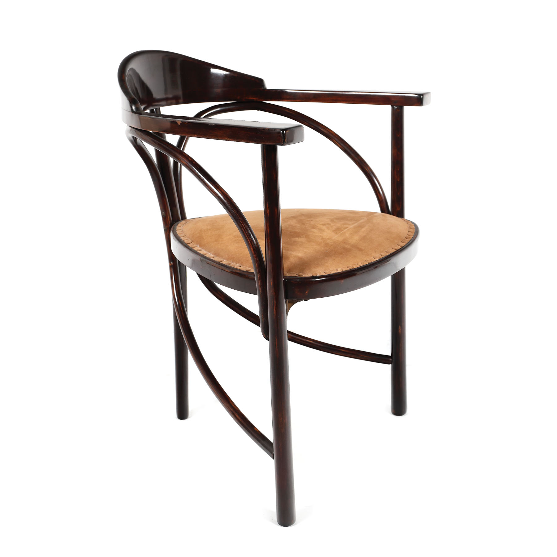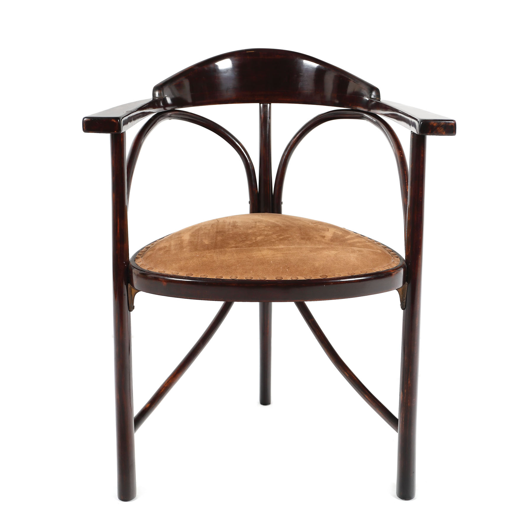 Fotoliu Thonet, cu trei picioare, cu brațe deschise cotiere, având șezuta triunghiulară, tapițată cu piele. În stil Sezession.
