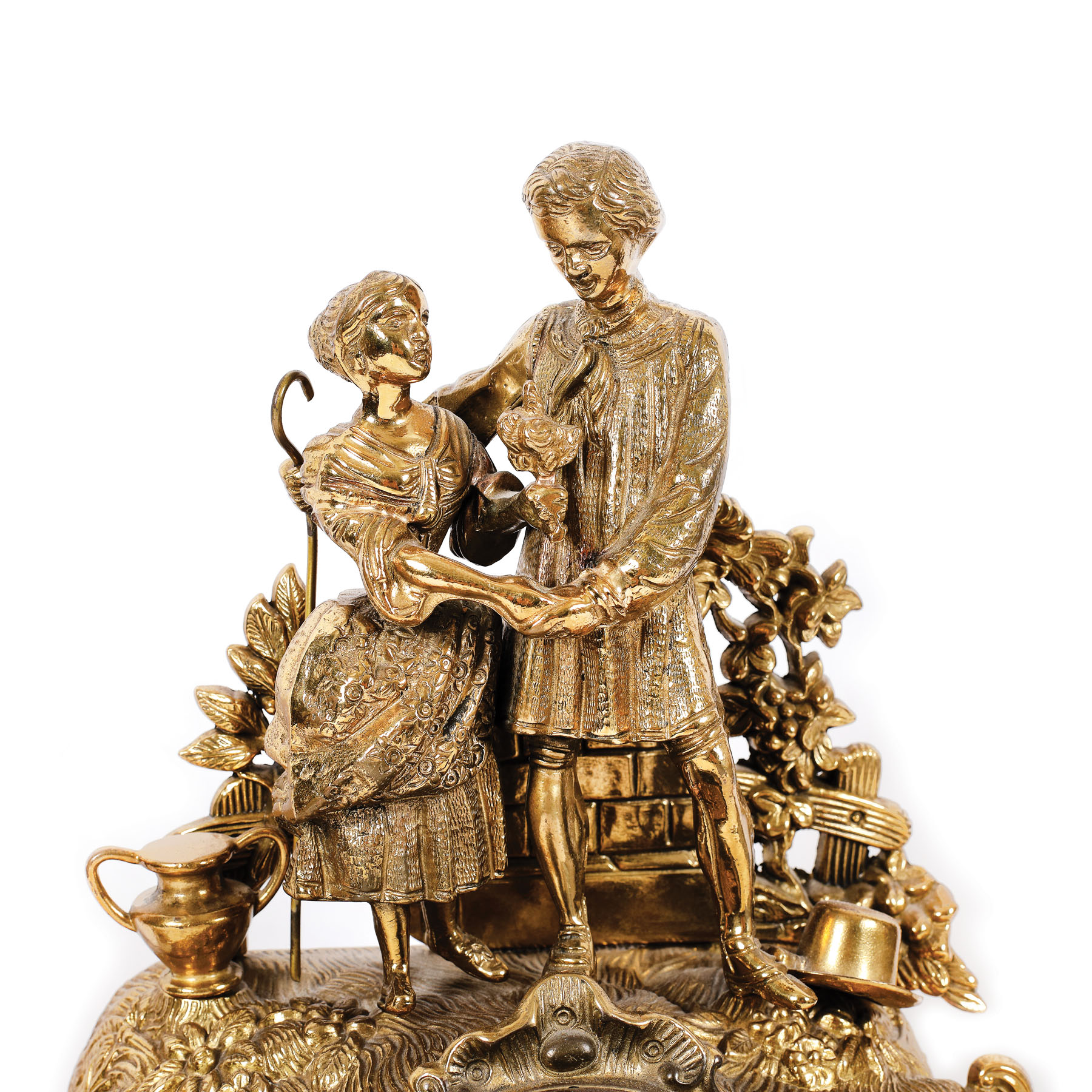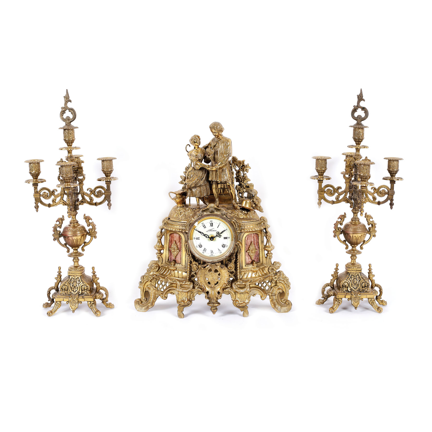 104. Garnitură Neo-Rococo, pentru șemineu, formată din două candelabre și o casetă pentru ceas surmontată de figurine idilice