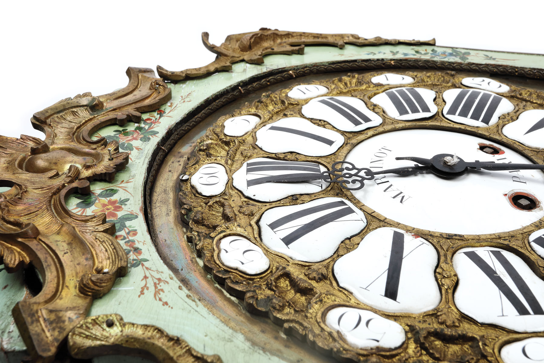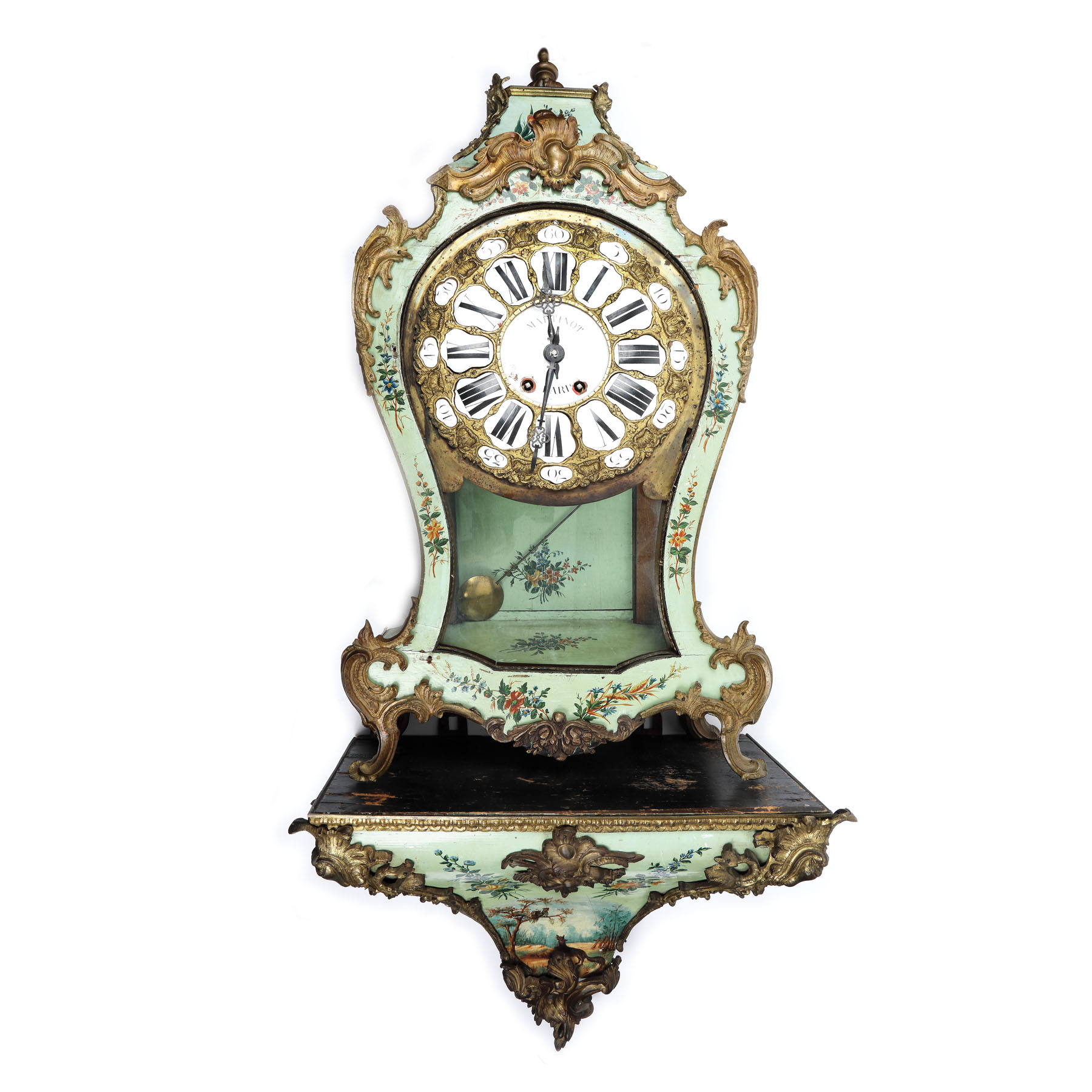 183. Impunător ceas de perete, din lemn pictat manual, decorat cu un peisaj, elemente florale și aplicații din bronz doré, începutul sec. XX