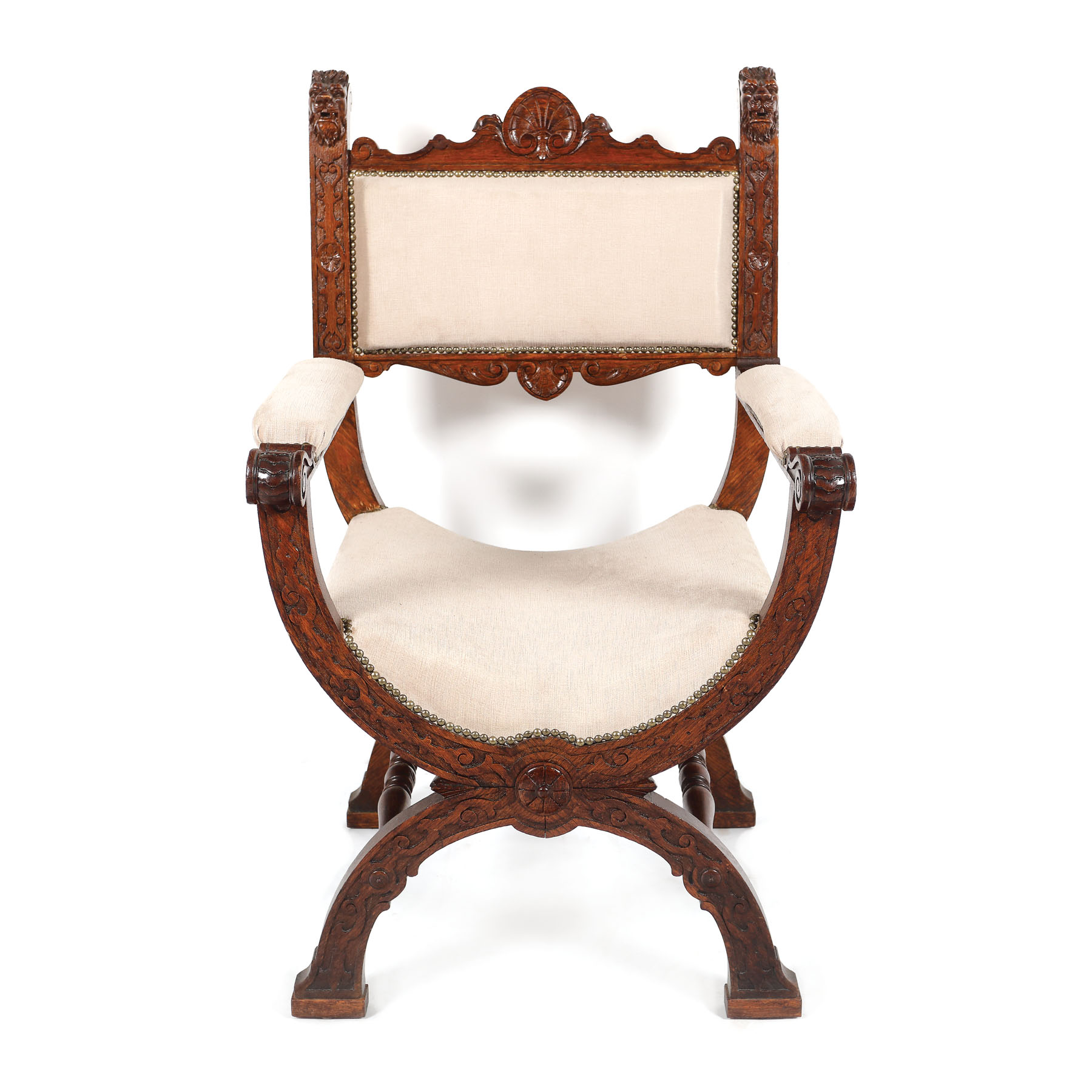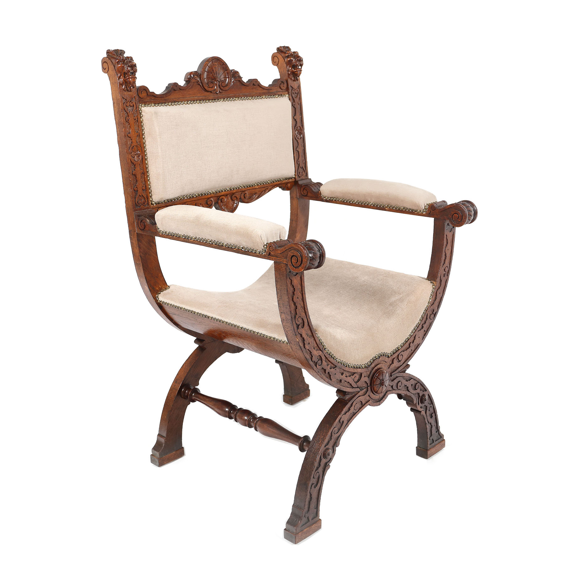 Jilț monumental, de tip dantesca, de inspirație Neo-Renascentistă, cu decor sculptat, cu montanți terminați în capete de leu.