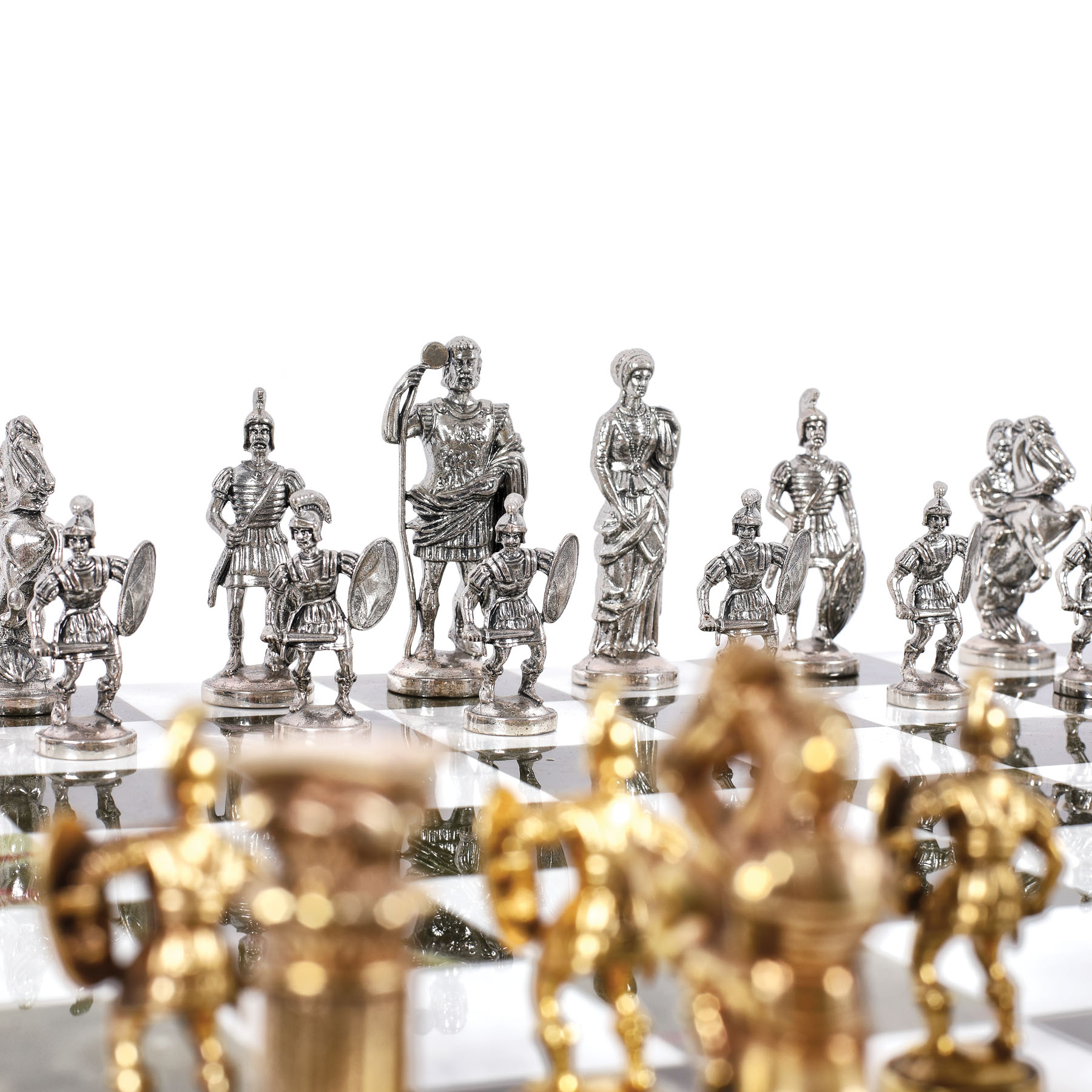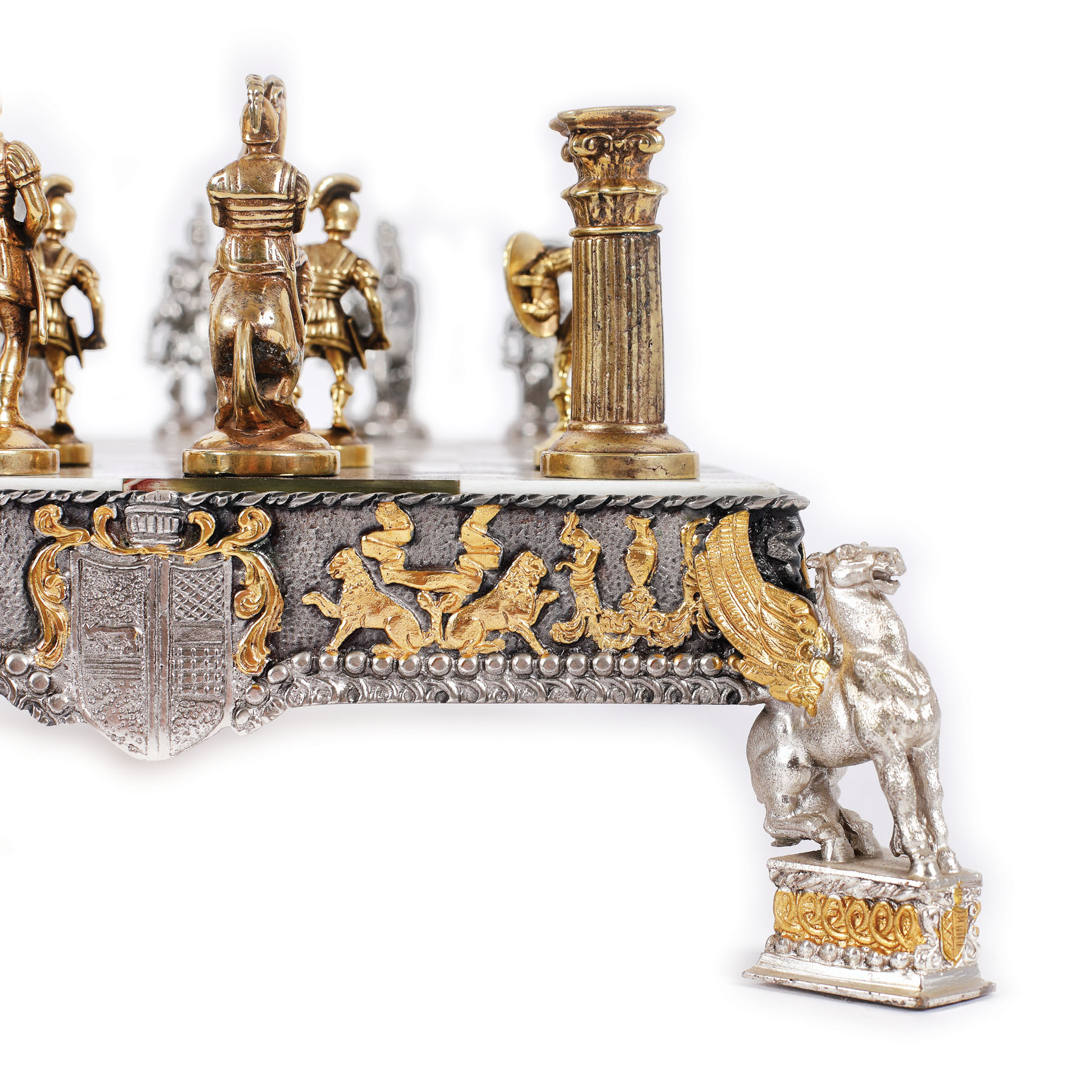 181. Joc de șah de inspirație Empire, cu piese din argint parțial aurit și tablă din marmură și onix [Sec. XX]