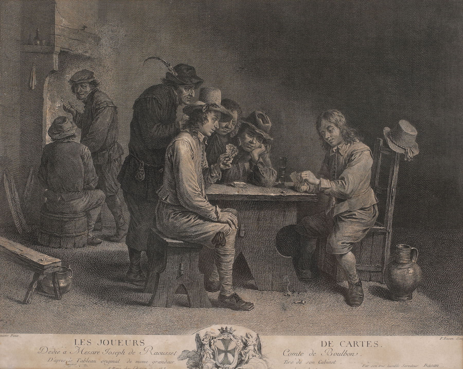 semnat, gravat, dreapta jos, sub cadru, ”F. Basan sculp.”; notat, gravat, stânga jos, sub cadru, ”Teniers pinx”