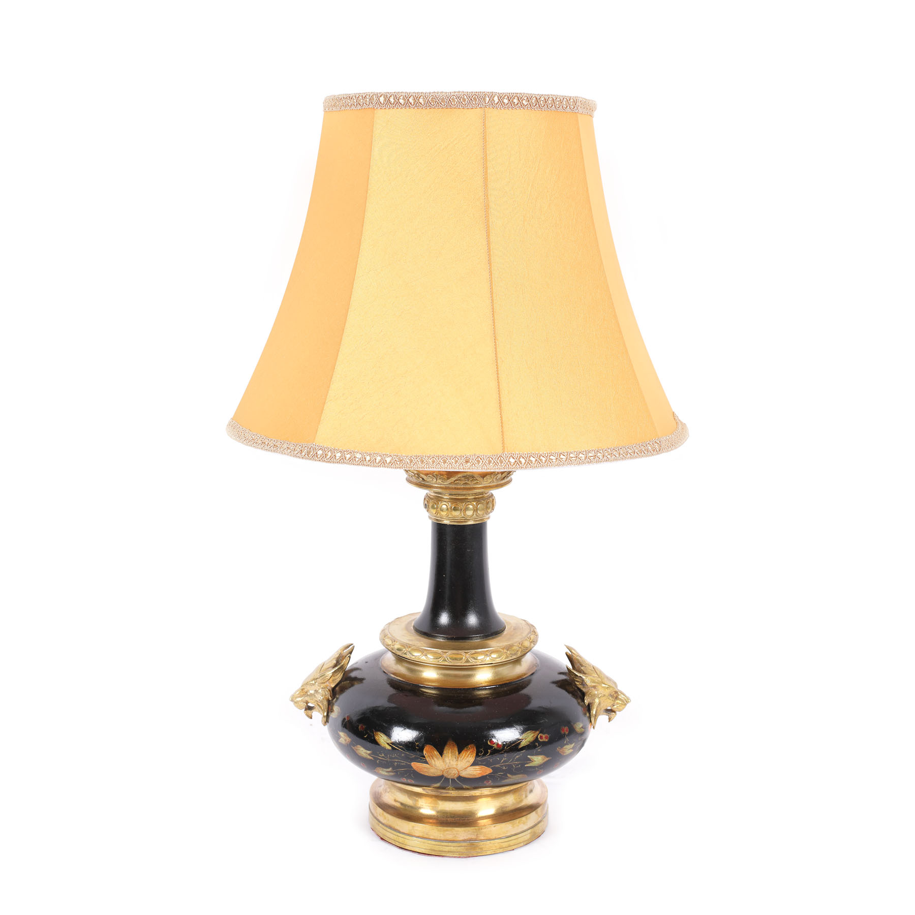 204. Lampă de masă realizată în manieră Napoleon III, din bronz aurit și pictat cu email, decorată cu capete de lei, cca. 1900