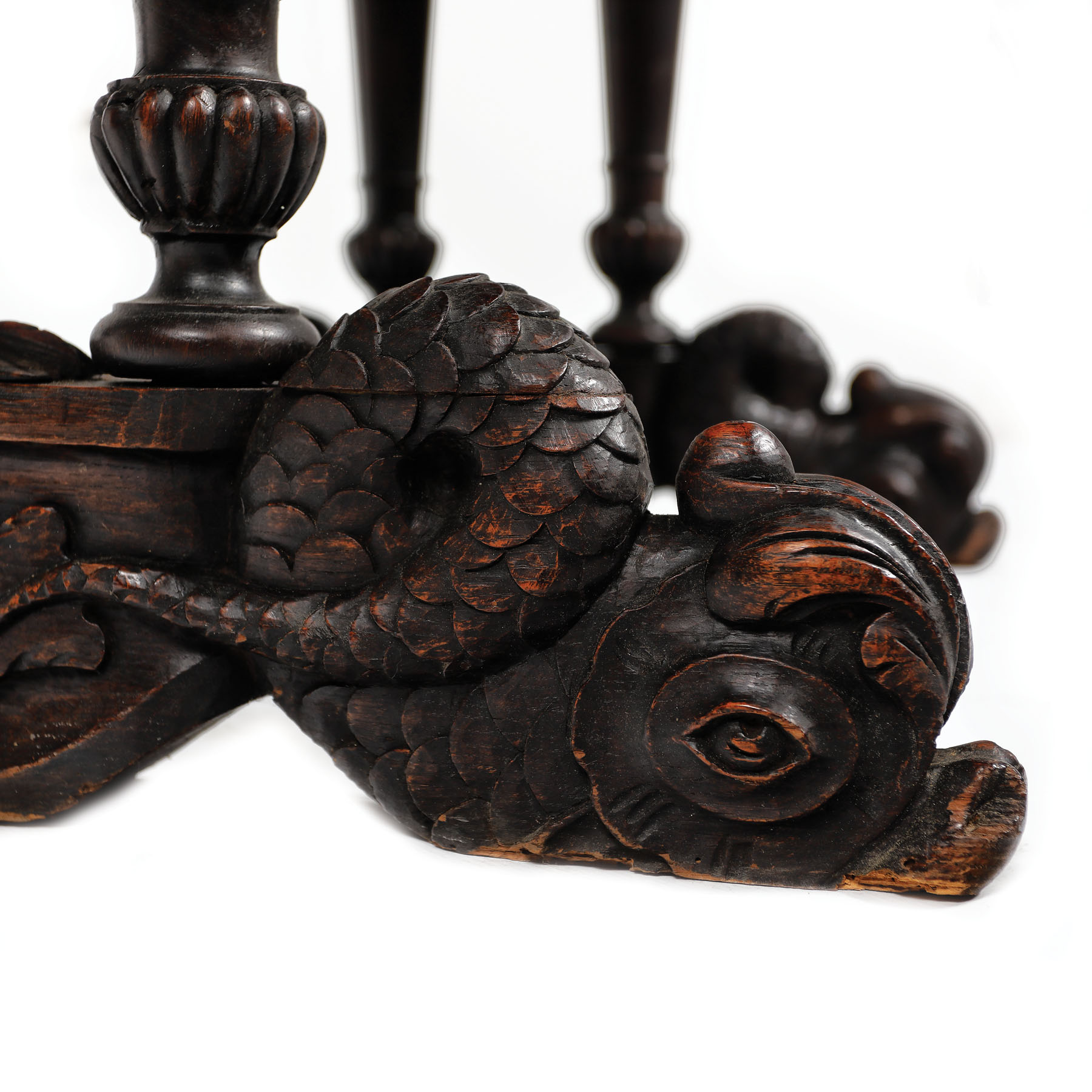Masă pe picioare baluștri pereche, uniți inferior de pești fantastici în ronde-bosse, cu decor bogat în manieră Neo-Renaștere italiană.