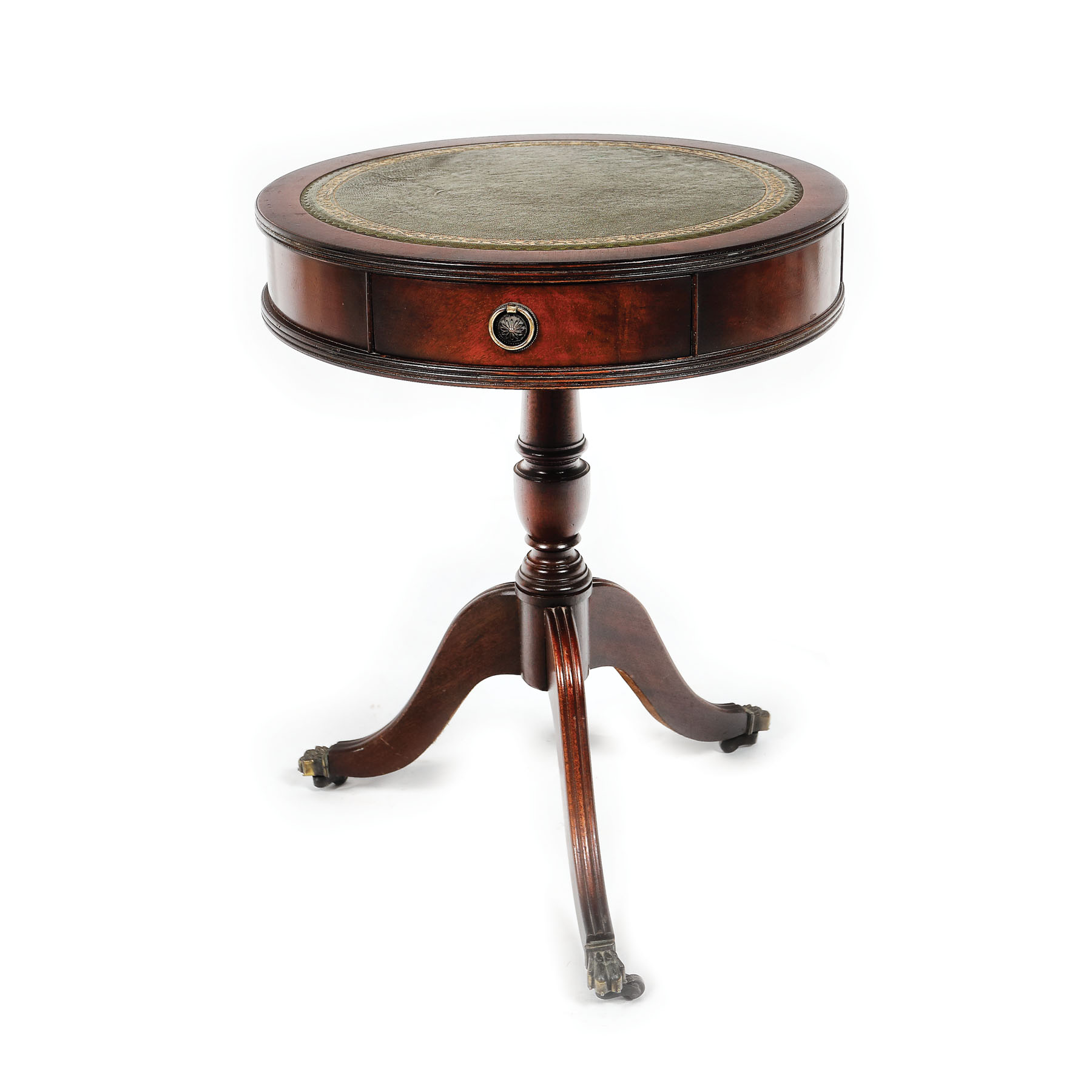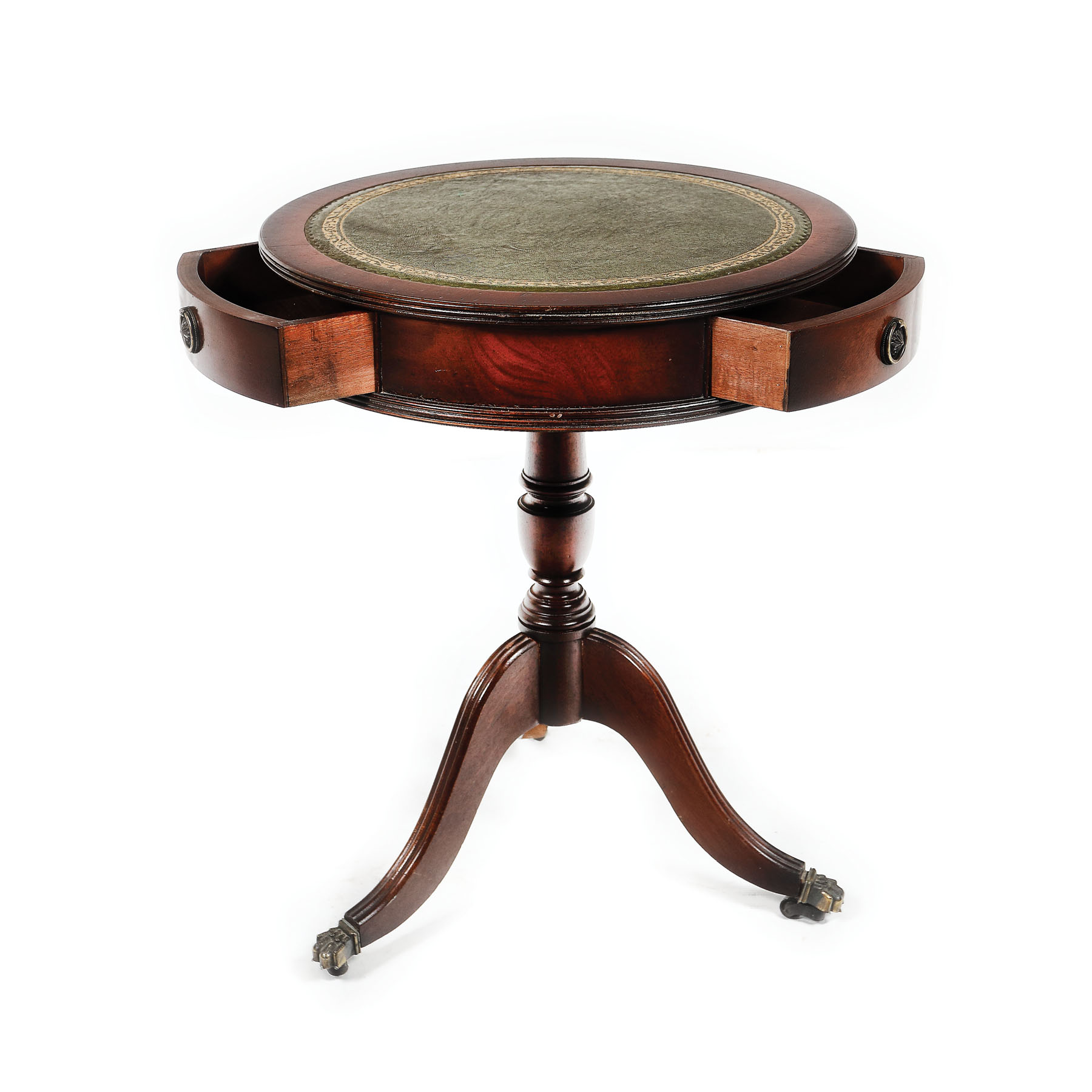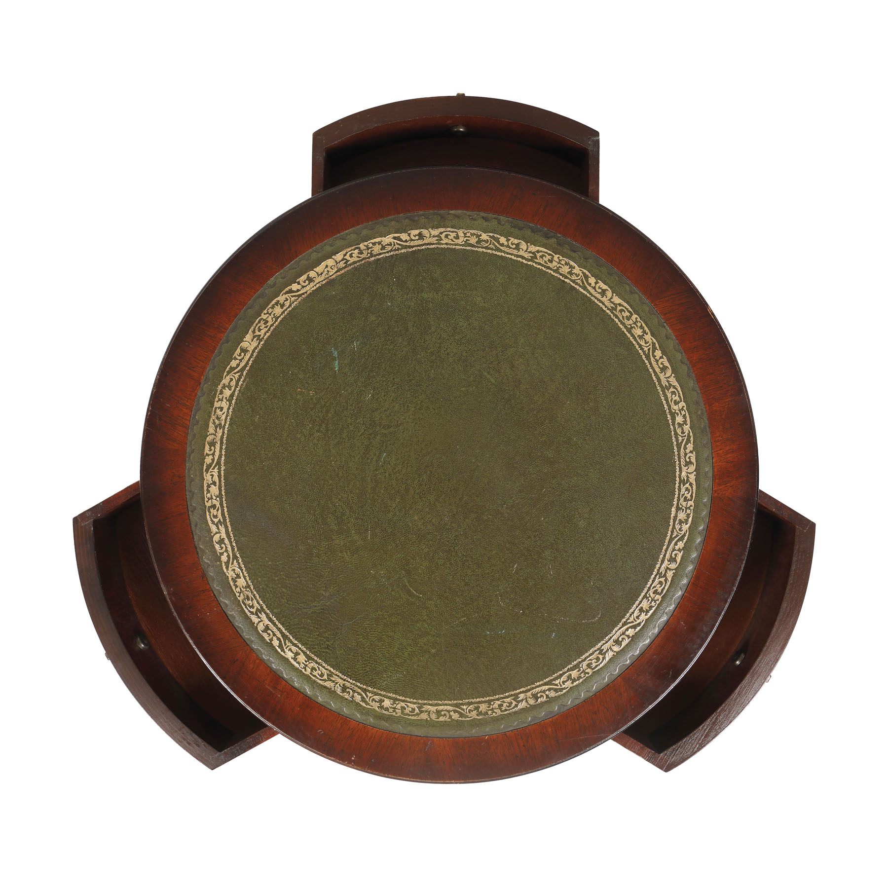 Masă mică de joc, pe picioare cu manșoane gheare de leu pe rotile, cu blat circular, cu trei sertare mici la centură.