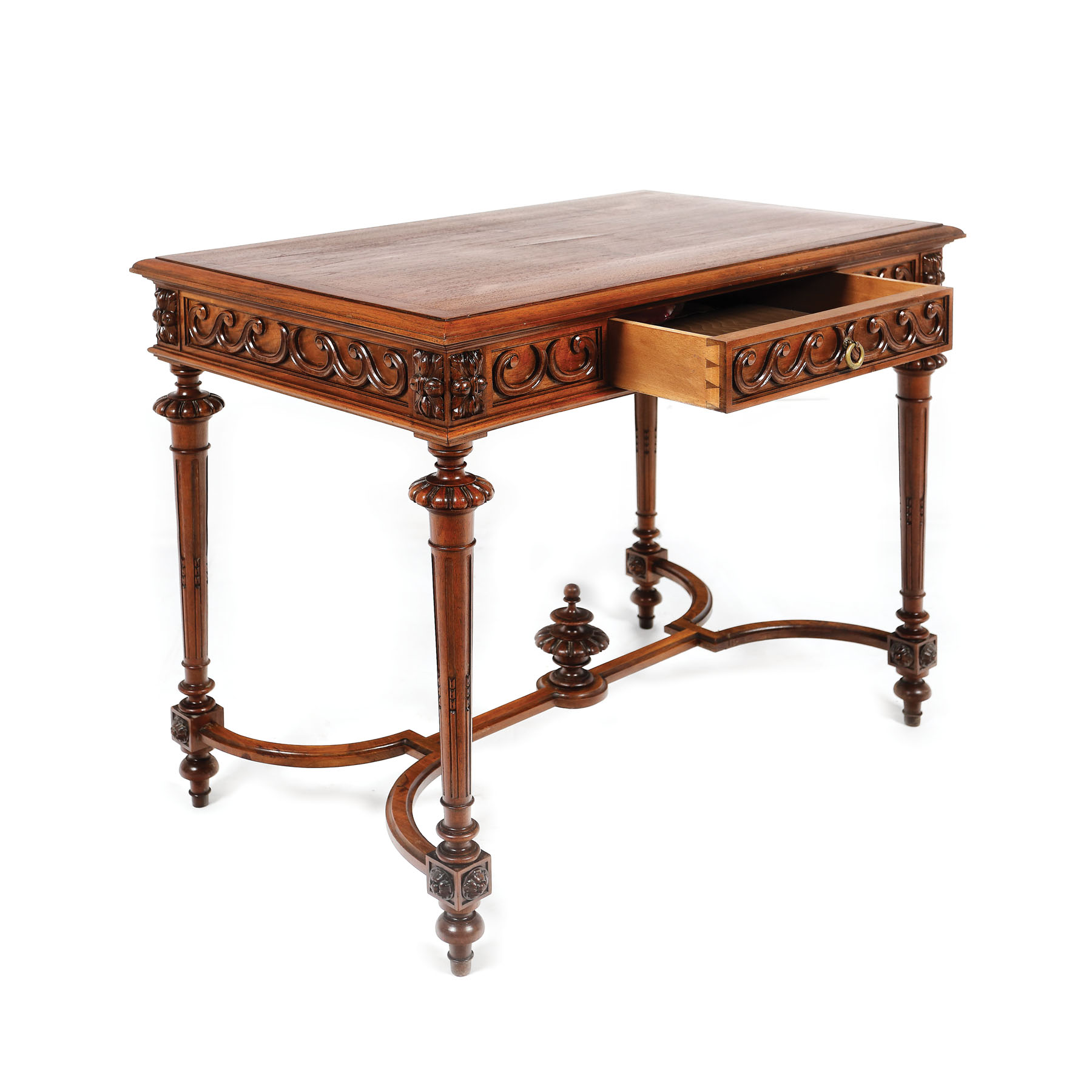 Masă cu blat dreptunghiular, cu sertar la centură, cu decor „val grecesc”, pe picioare unite prin traverse complexe, surmontate de ornament vască. Cu elemente decorative Neo-Renaștere. Masa prezintă o ușoară fisură în zona mediană a furnirului.