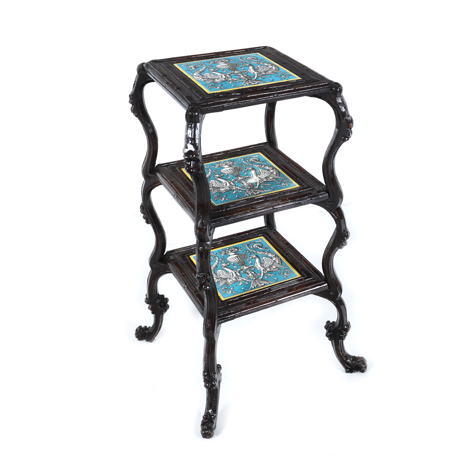 Măsuță realizată în manieră Neo-Renascentistă, din lemn de nuc. Cadrul din lemn sculptat sub forma unor ramuri, ce coboară către cele patru picioare cu terminații în forma unor gheare de leu. Măsuța este compusă din trei etajere ornate cu panouri din faianță Creil-Montereau cu decor grotteschi.