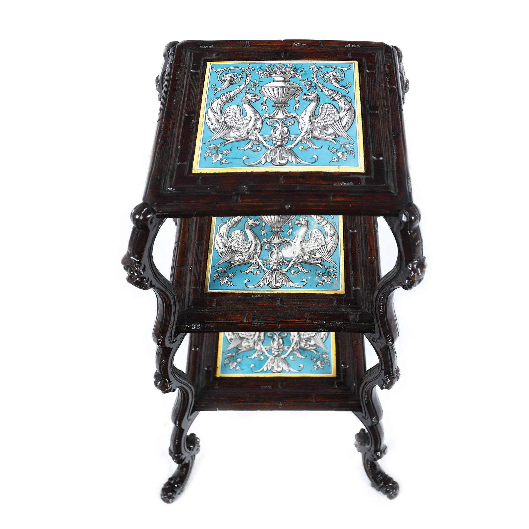 98. Măsuță realizată în manieră Neo-Renascentistă, ornată cu trei panouri din faianță Creil-Montereau, cu decor grotteschi, începutul sec. XX