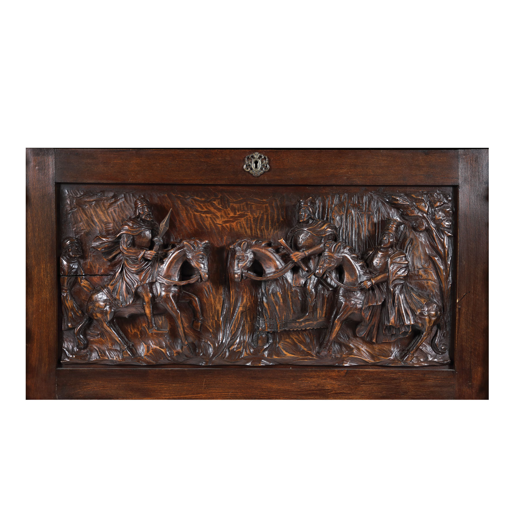 Armoire pe picioare mărunte, în față tălpici cu motiv grotesc, cele din spate console. Panourile frontale bogat sculptate în altorelief, cu personaje halebardieri, scene de luptă, călăreți, capete de ostași cu căști, realizate în casete dreptunghiulare și pătrate. Montanți sculptați cu figuri grotești, capete de oșteni și grupaje de fructe. Fronton cu lob reliefat la mijloc și friză cu imbricații. Piesă importantă, de autor, cu o compoziție în stilul Neo-Renașterii spaniole.