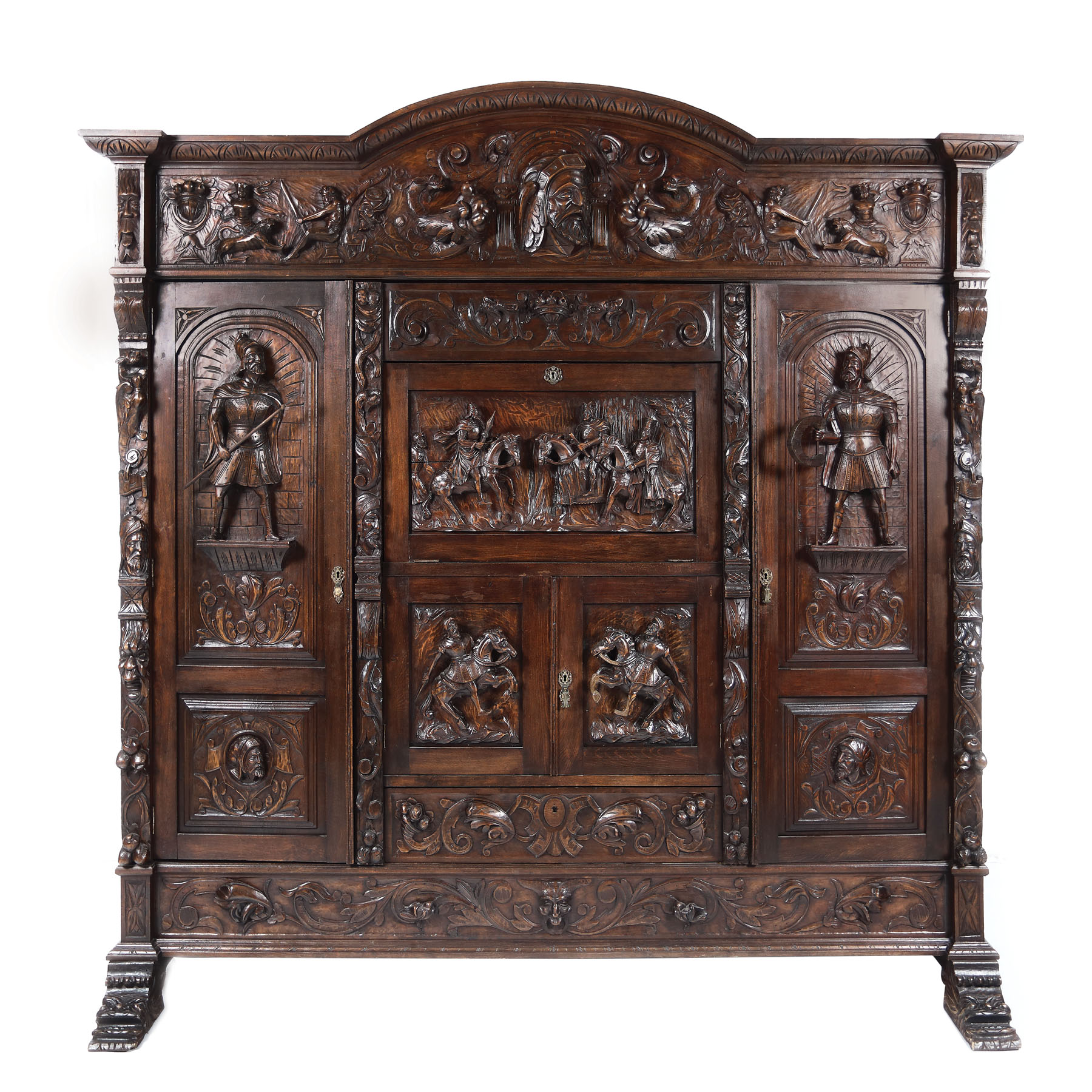 124. Monumental dulap în stilul Neo-Renașterii spaniole, din lemn de stejar amplu sculptat, cca. 1875, piesă de colecție