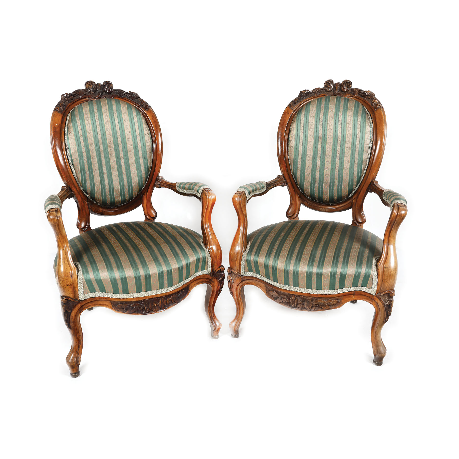 164. Pereche de fotolii de inspirație Louis Philippe, din lemn de nuc, sfârșitul sec. XIX