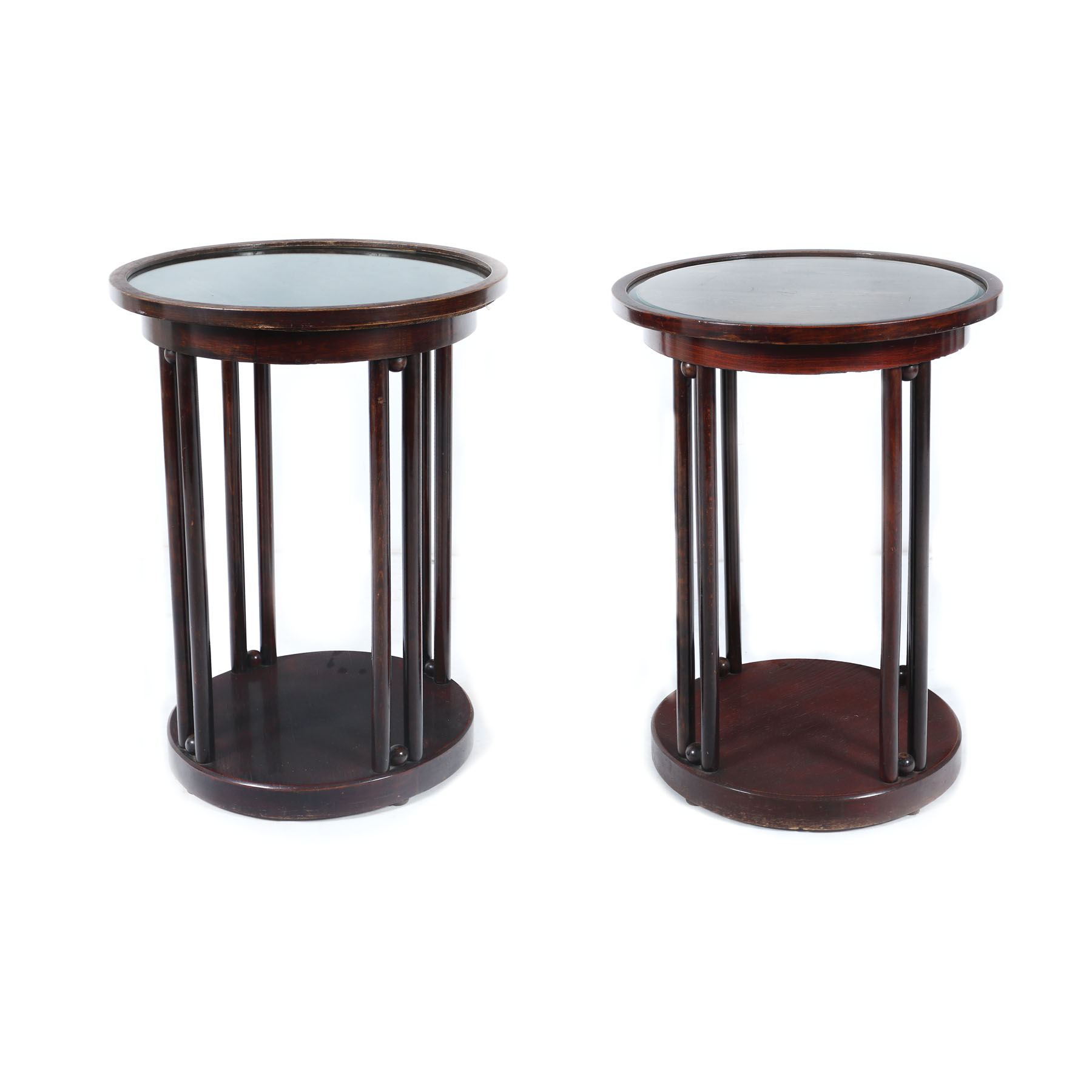 Set de două mese circulare din lemn de nuc. Blatul fiecăreia este pe format rotund, având o portecție din sticlă, stabilizată printr-un cadru de lemn detașabil. Blatul este fixat în patru puncte de legătură, formate de căte două baghete circulare ce au la baza prinderii câte o sferă din lemn. Designul acestui model a fost realizat de Josef Hoffmann pentru Thonet.