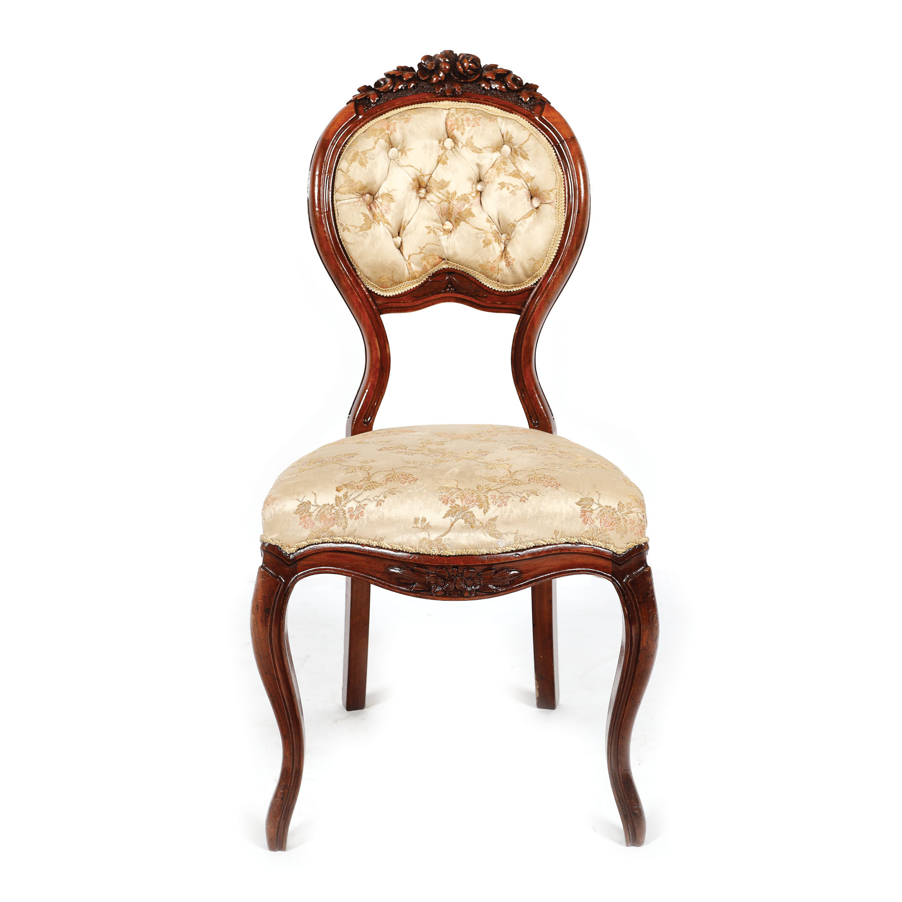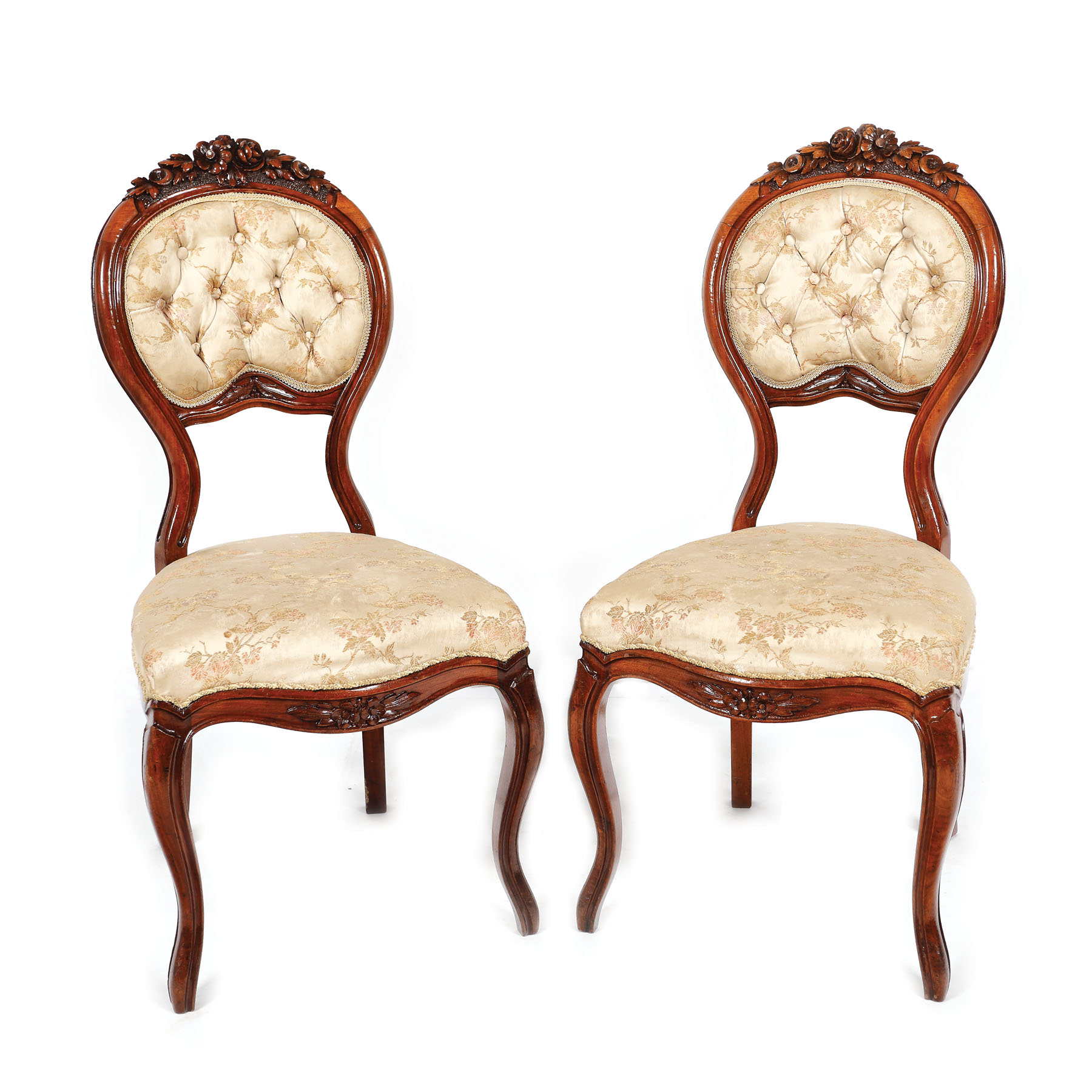 Pereche de scaune în manieră Louis Philippe, cu șezut și spătar decorate cu material textil decorat cu ramuri înflorite, spătarul cu butoni și cadru surmontat de buchet floral.