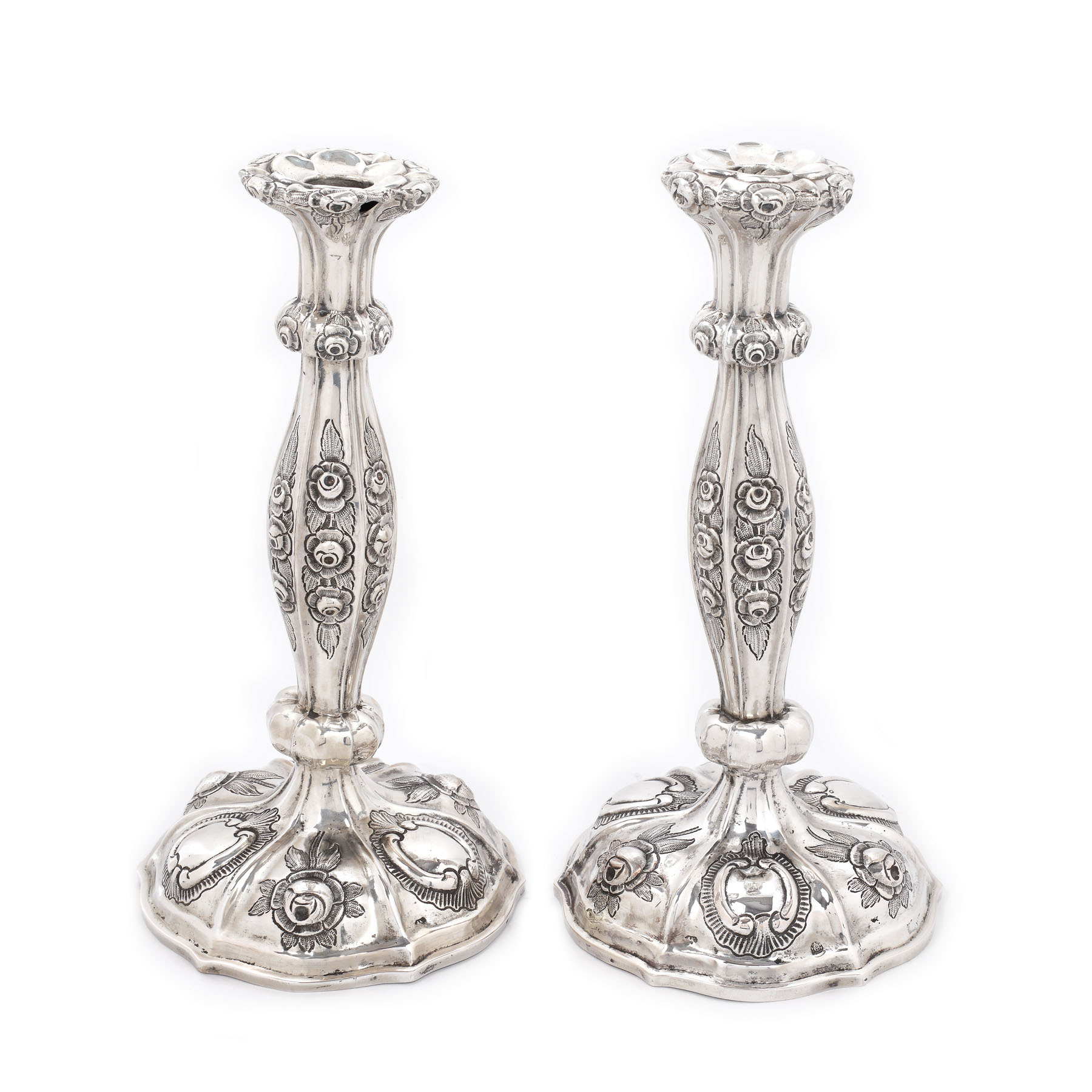 250. Pereche de sfeșnice din argint, decorată cu lauri stilizați și elemente florale, cca. 1860