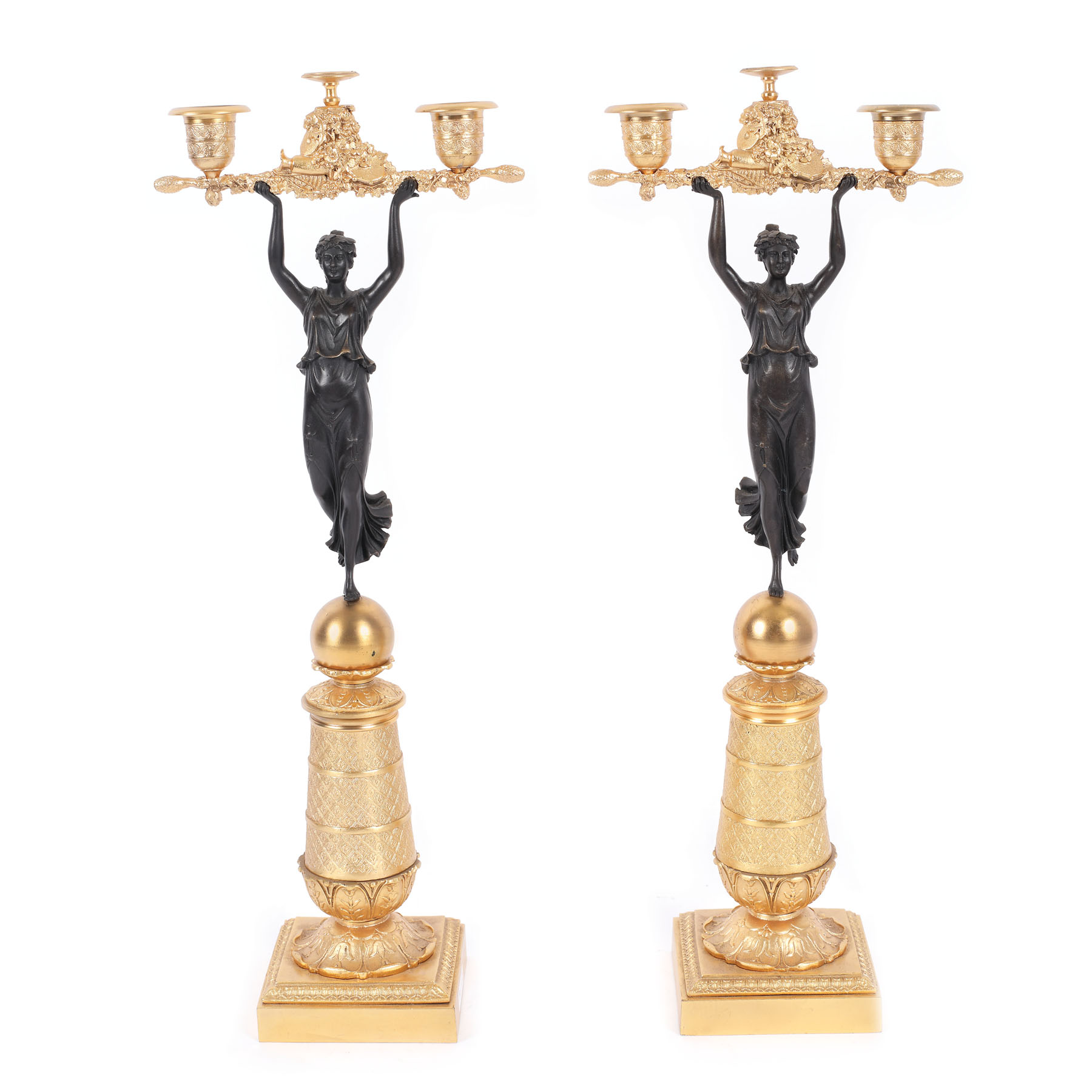 159. Pereche de sfeșnice în stil Empire, din bronz doré, susținute de figuri feminine, sfârșitul sec. XIX