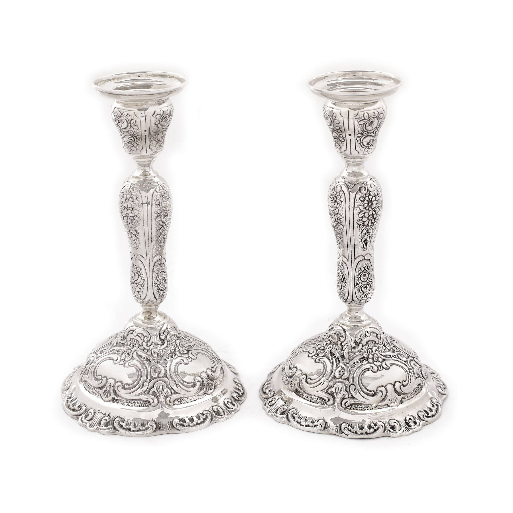 225. Pereche de sfeșnice în stil Neo-Rococo, din argint, decorată cu elemente florale, sfârșitul sec. XIX