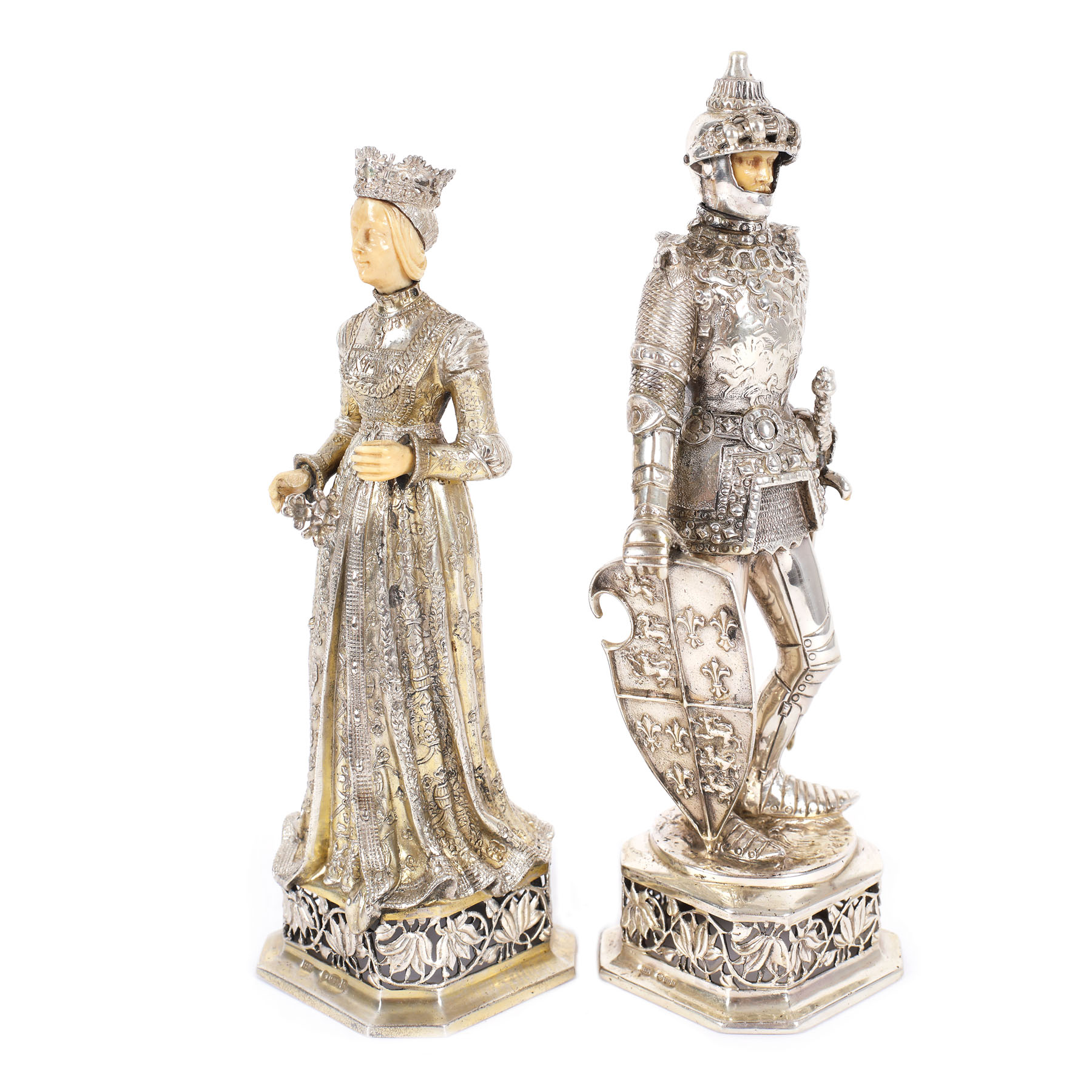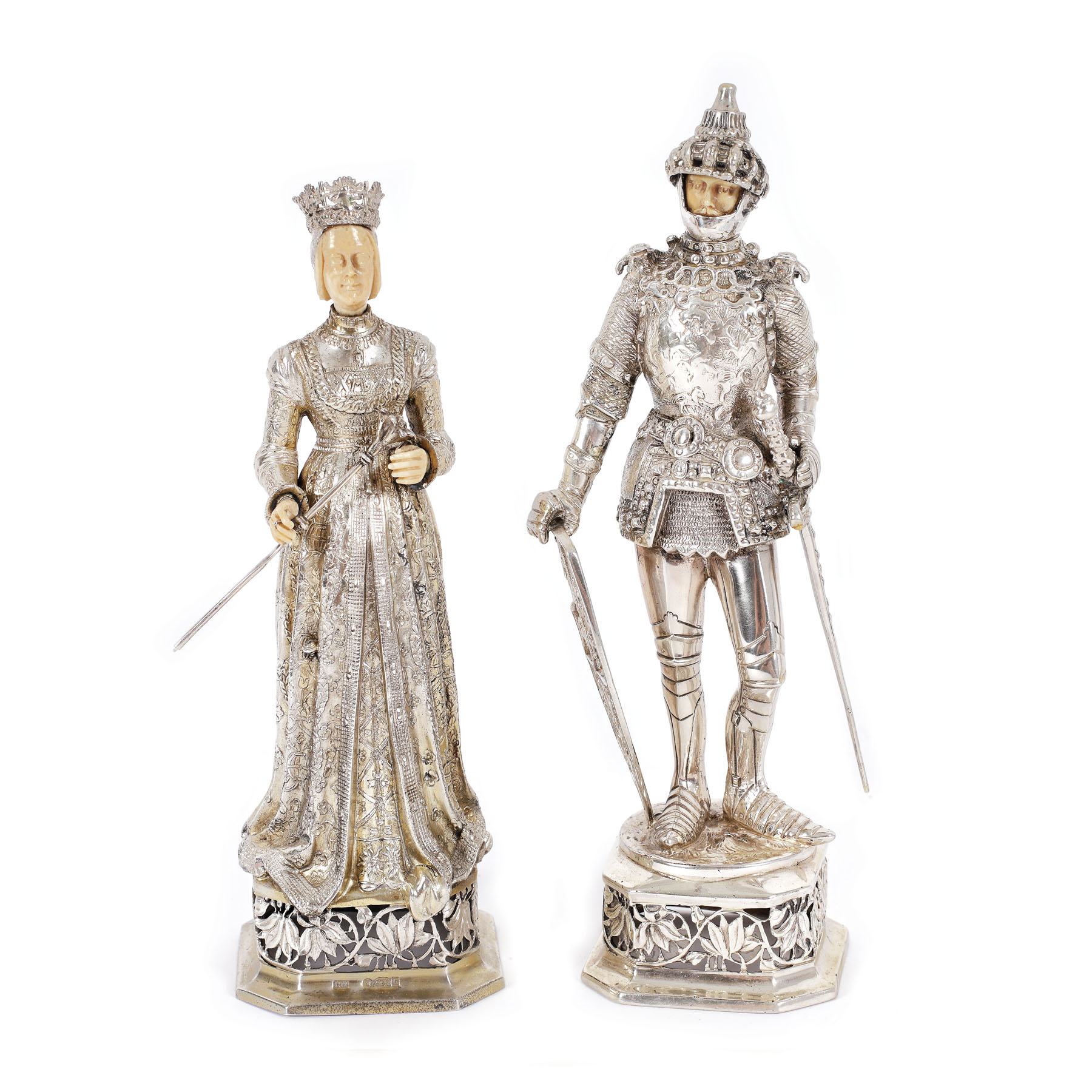 120. Pereche de statuete decorative din argint, ilustrând un cavaler și regina sa, cca. 1905, piese de colecție