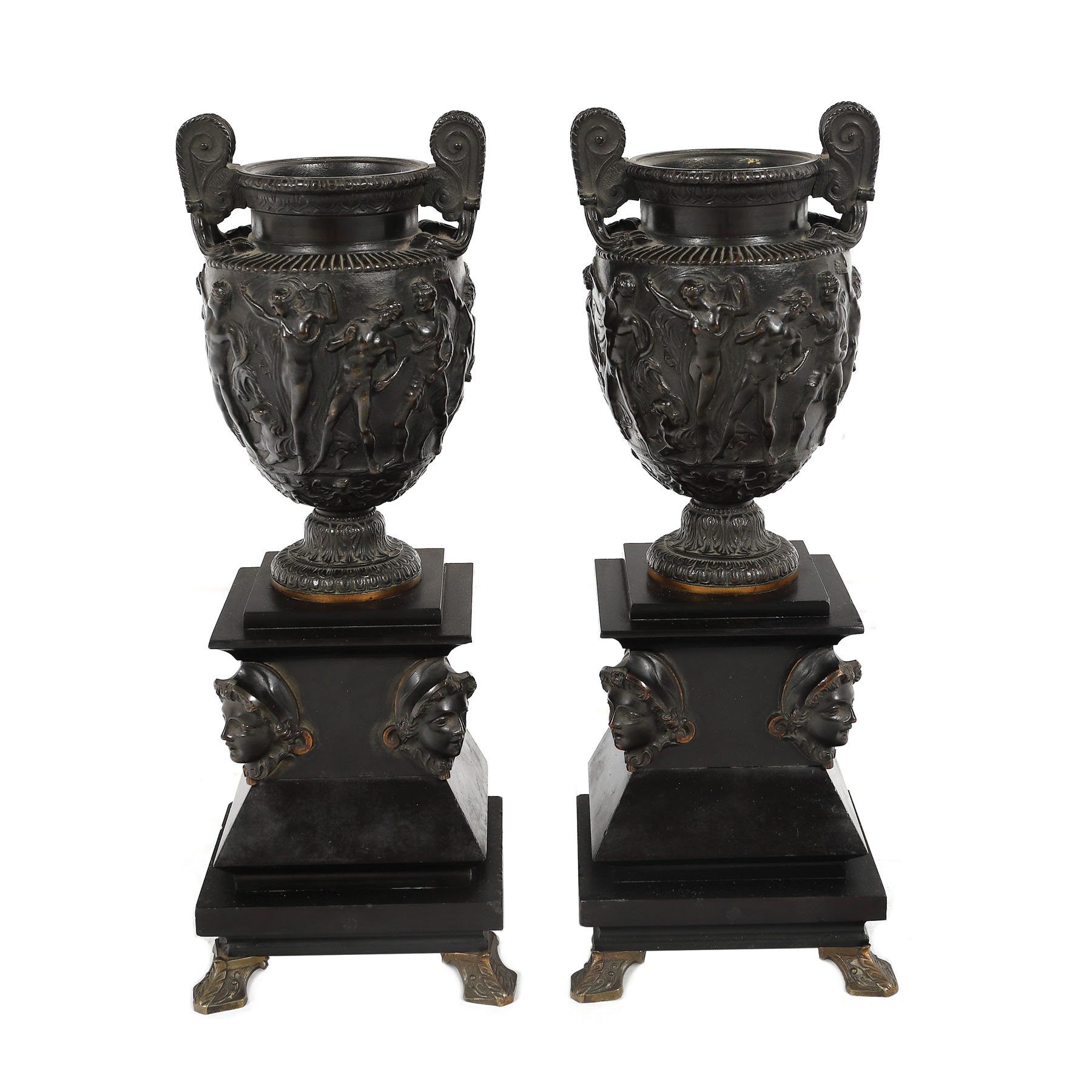 128. Pereche de urne Historiste, din bronz și marmură [Sec. XX]