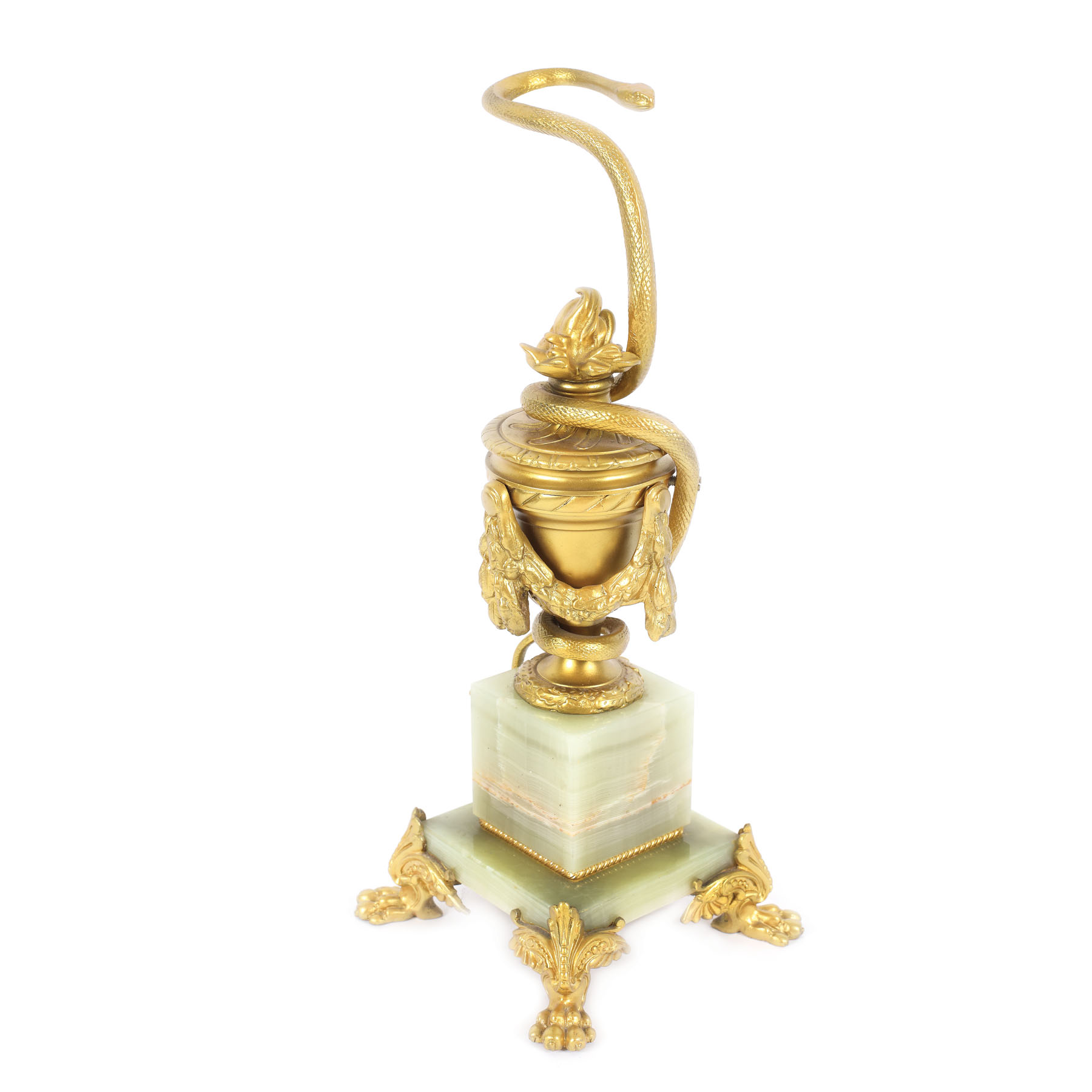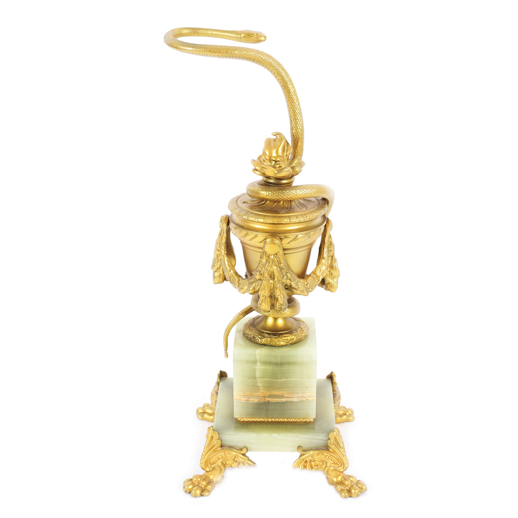 208. Piesă decorativă cu șarpe încercuit, din bronz doré și postament din onix, sfârșitul sec. XIX