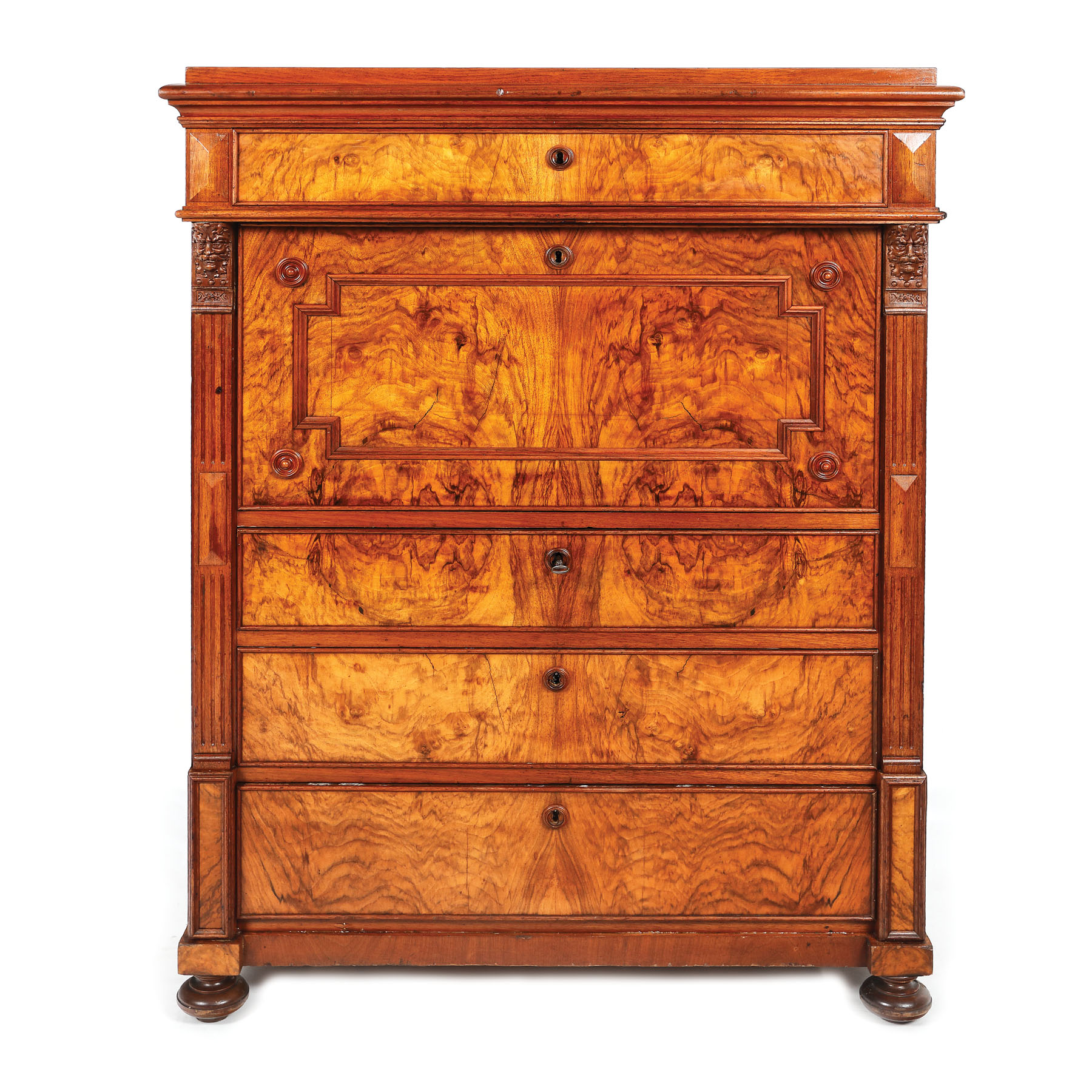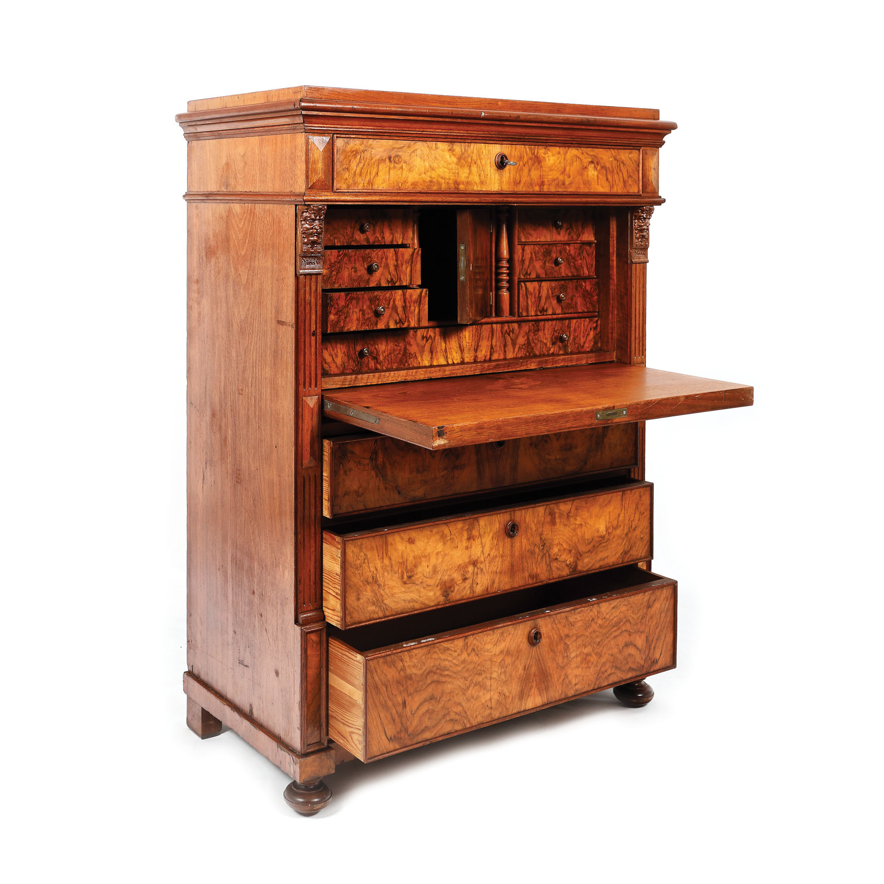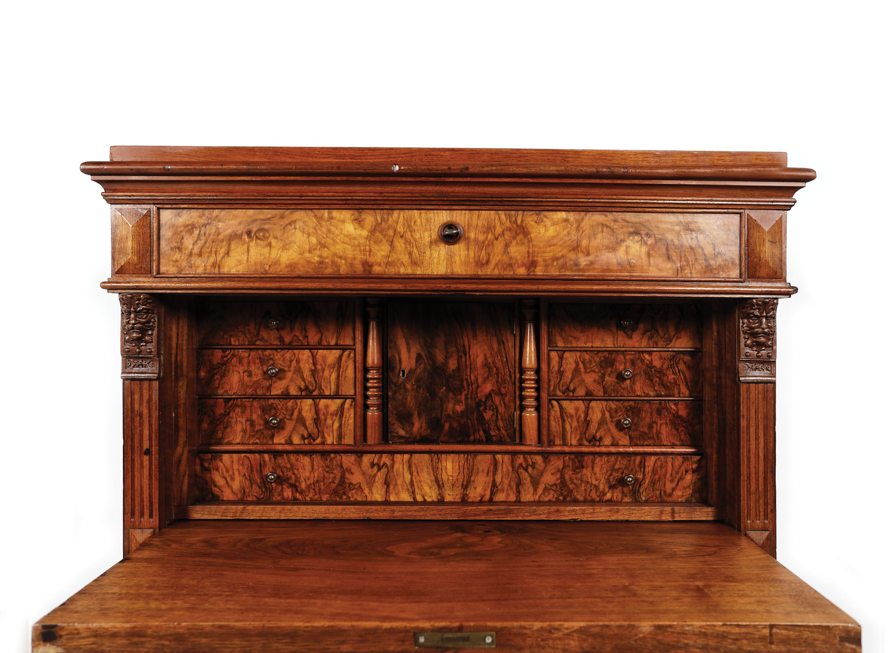 235. Secretaire Historist, din lemn de pin furniruit cu nuc și rădăcină de nuc, sfârșitul sec. XIX