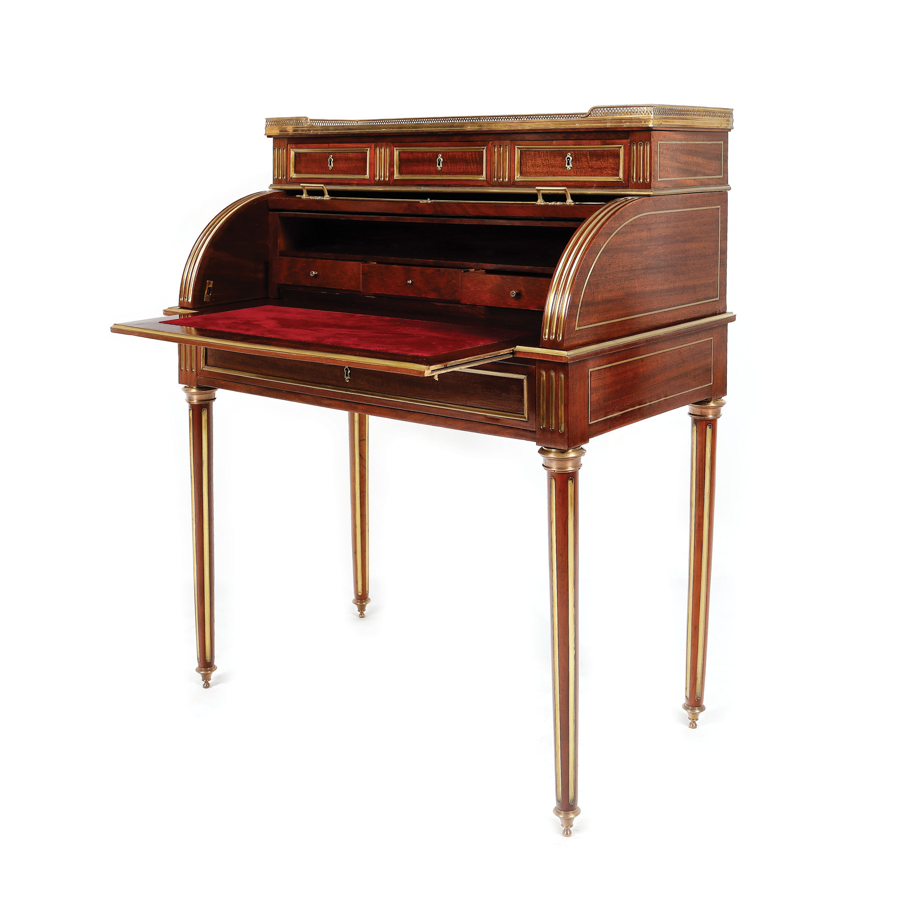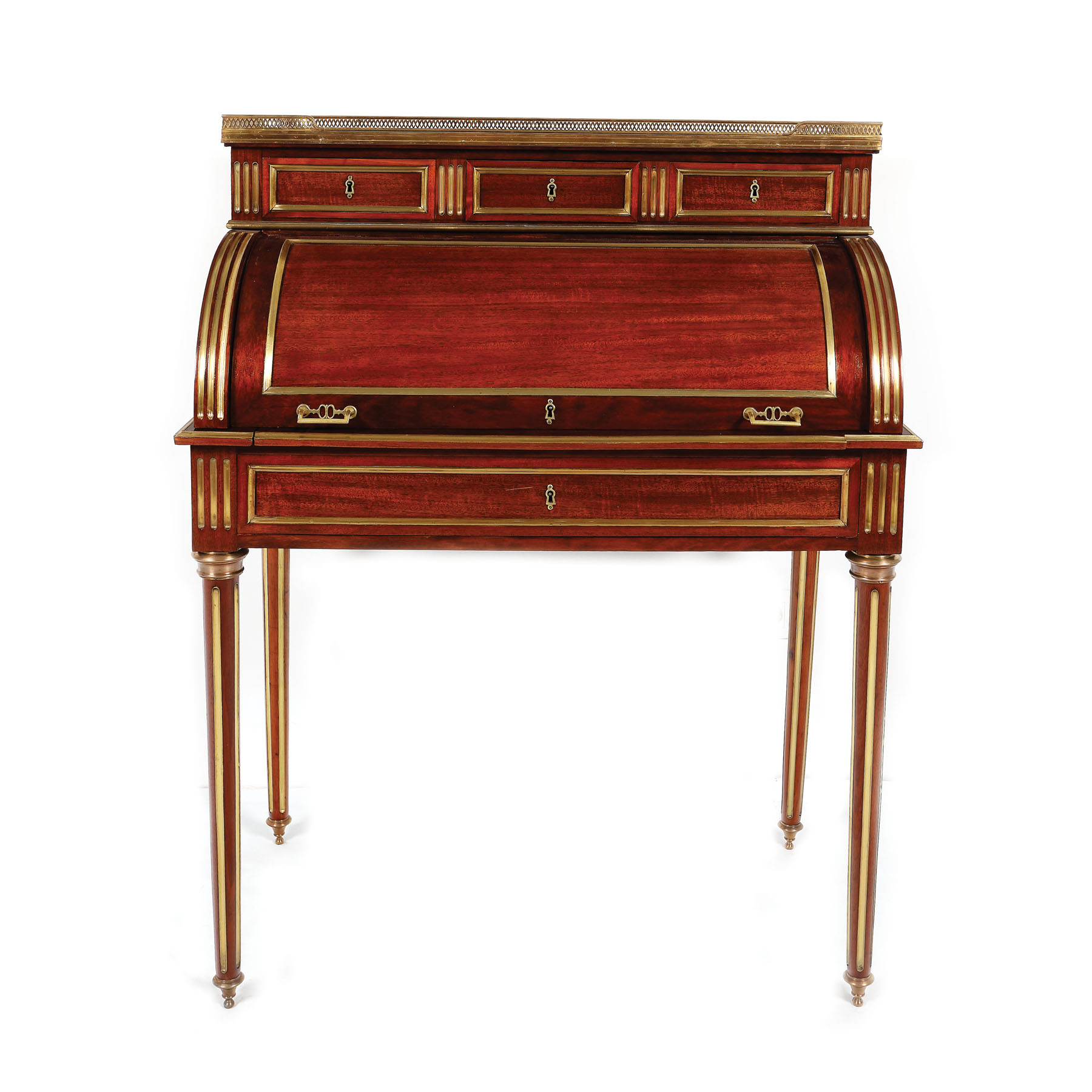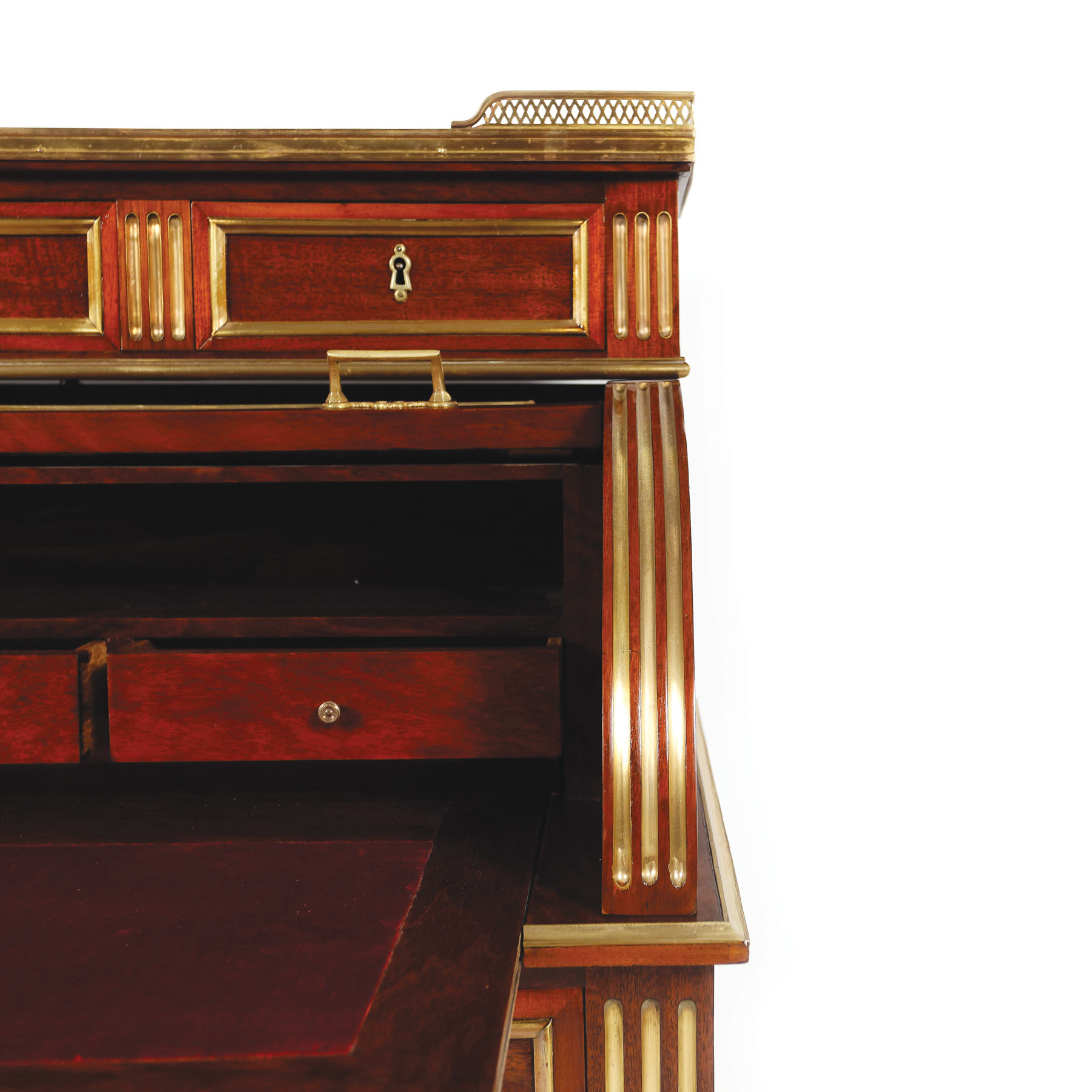 Birou cu cilindru, în stil Neo-Louis XVI, pe picioare fusuri canelate, cu sertar mare la centură, ușă tip cilindru, ce închide blat de scris, rabatant, trei sertare și poliță, surmontat de trei sertare și blat dreptunghiular din marmură, cu decor grilajat.