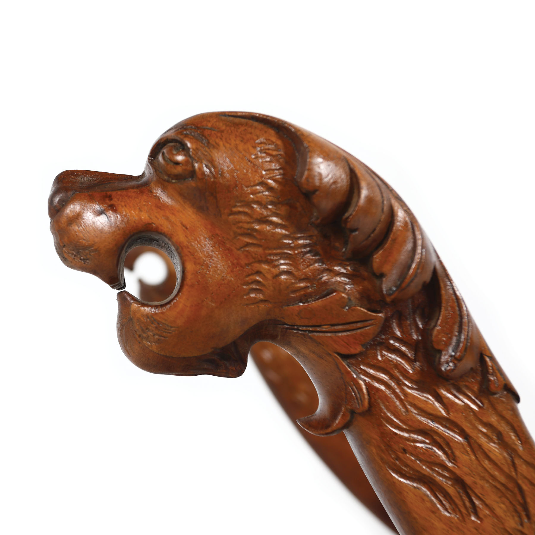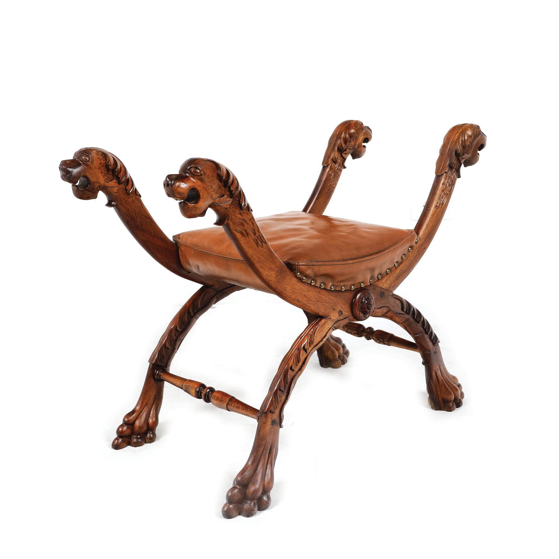 Taburet cu picioare terminate în gheare de leu, cu montanții - cotiere capete de leu, cu șezut mic, tapițat în piele. Tipologie clasică, de sorginte antică, cu elemente decorative Neo-Renaștere italiană.