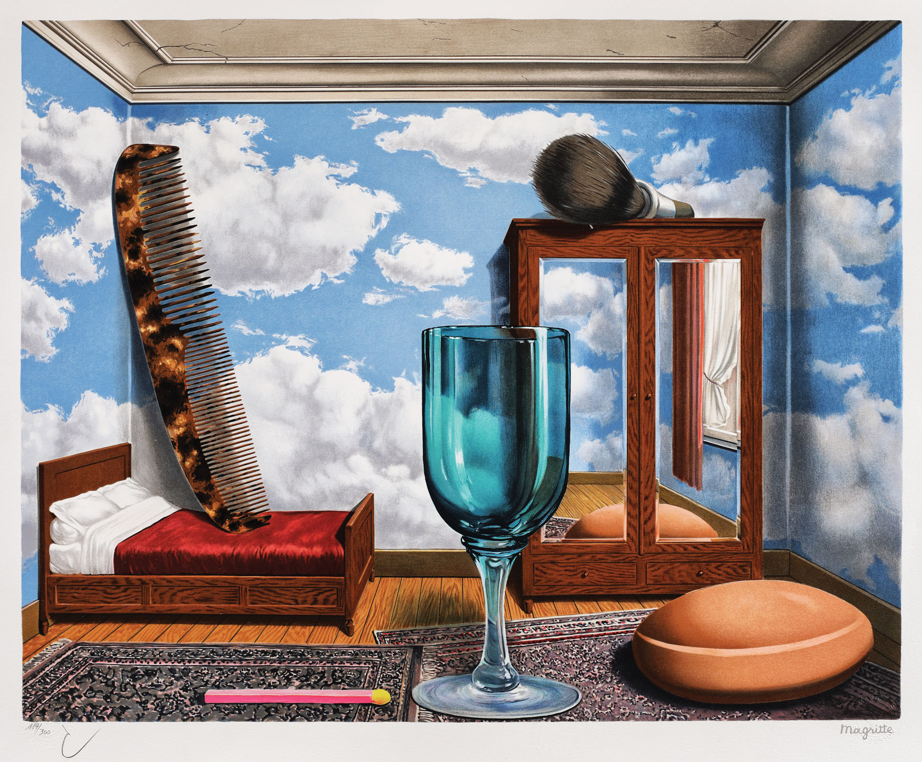semnat, gravat, dreapta jos, sub cadru, "magritte"; numerotat stânga jos, sub cadru, în creion, "187/300"; dreapta jos, ştampilă de atelier, "Magritte SUCCESION"; stânga jos, ştampilă asociaţiei care deţine drepturile de autor, "CHERSCOVICI A.D.A.G.P, PARIS, 2011"