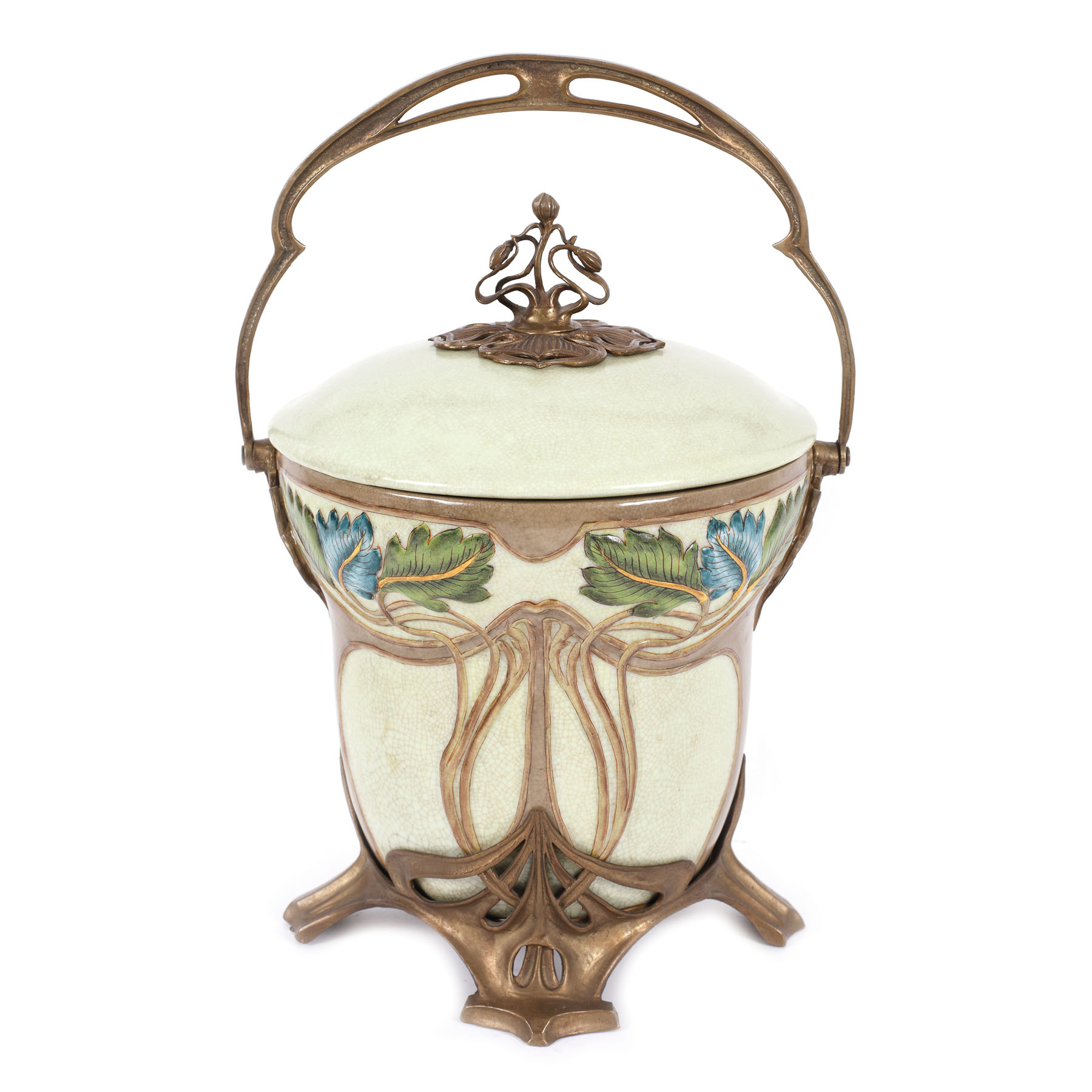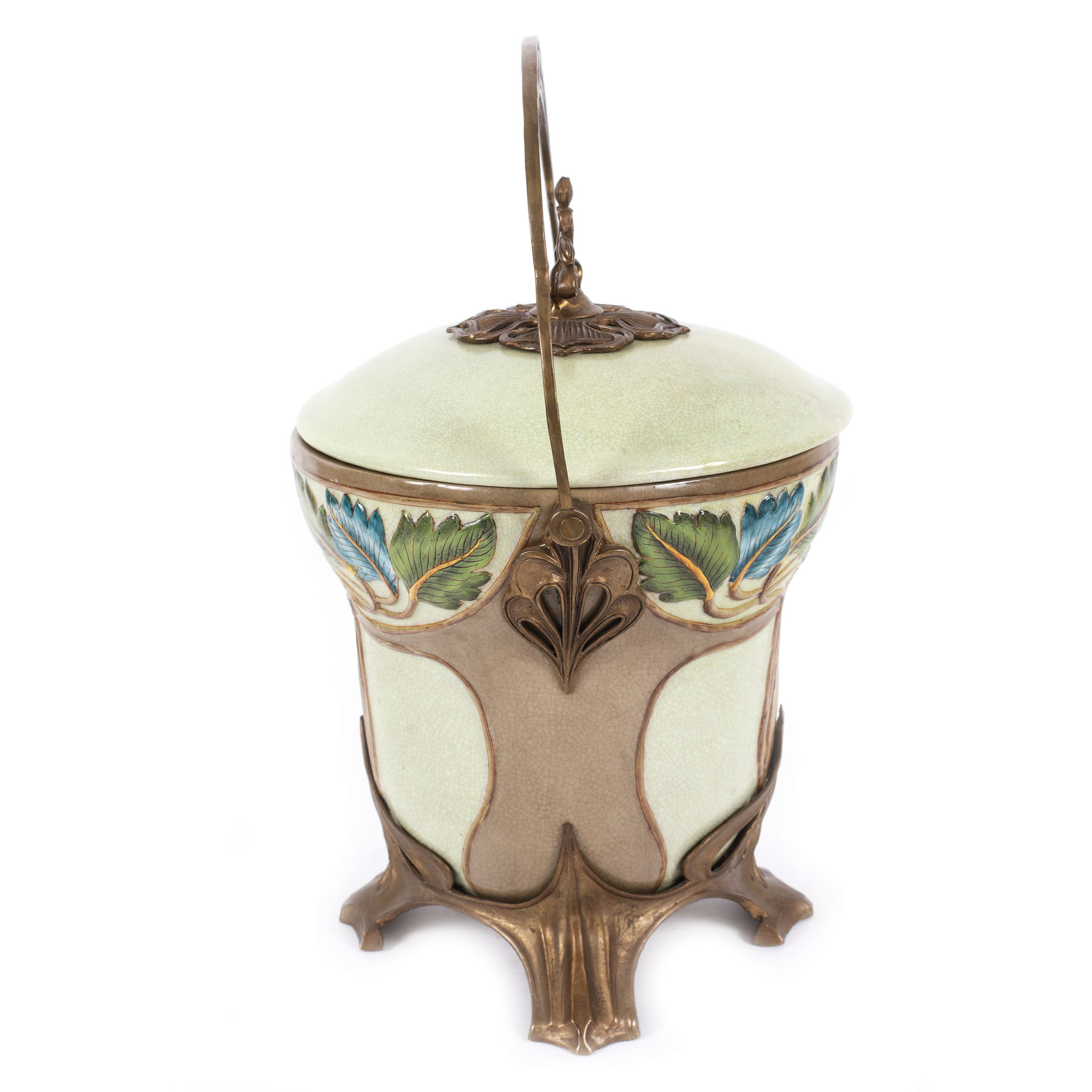 211. Vas decorativ în stil Art Nouveau, din faianță pictată cu email și suport din alamă, prima jumătate a sec. XX