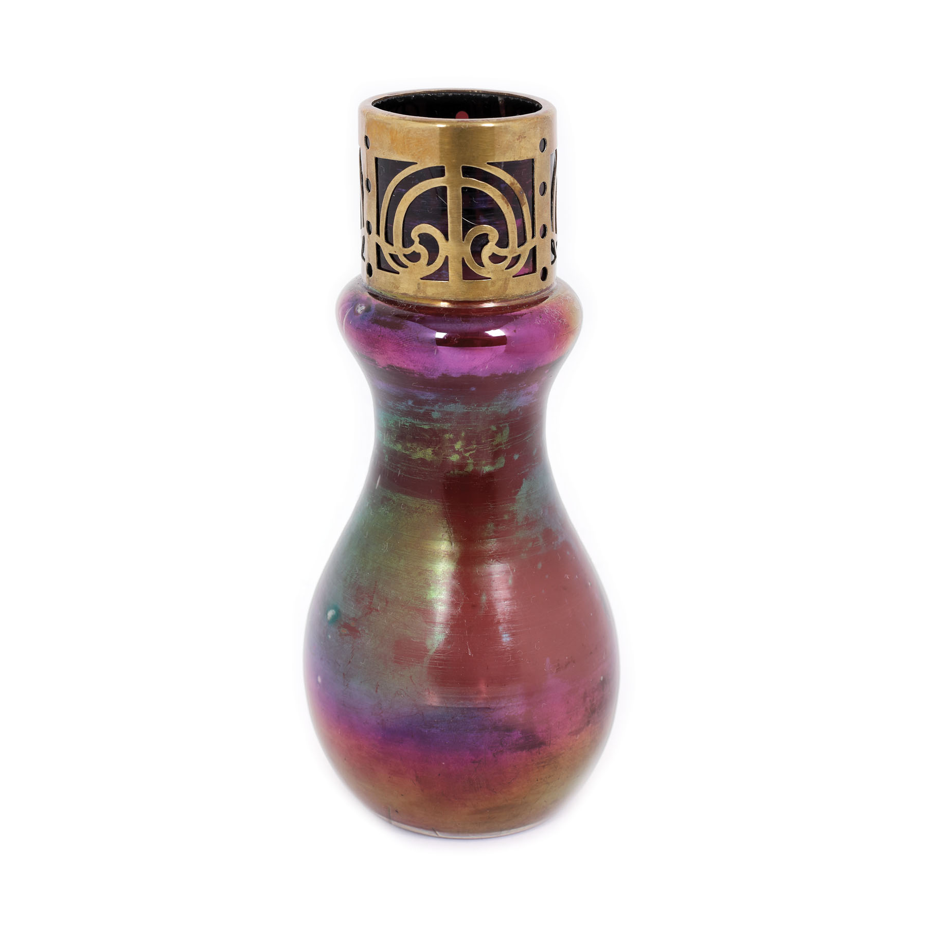 sticlă suflată în tipar, colorată în massă și cu acizi metalici; alamă turnată, cizelată
