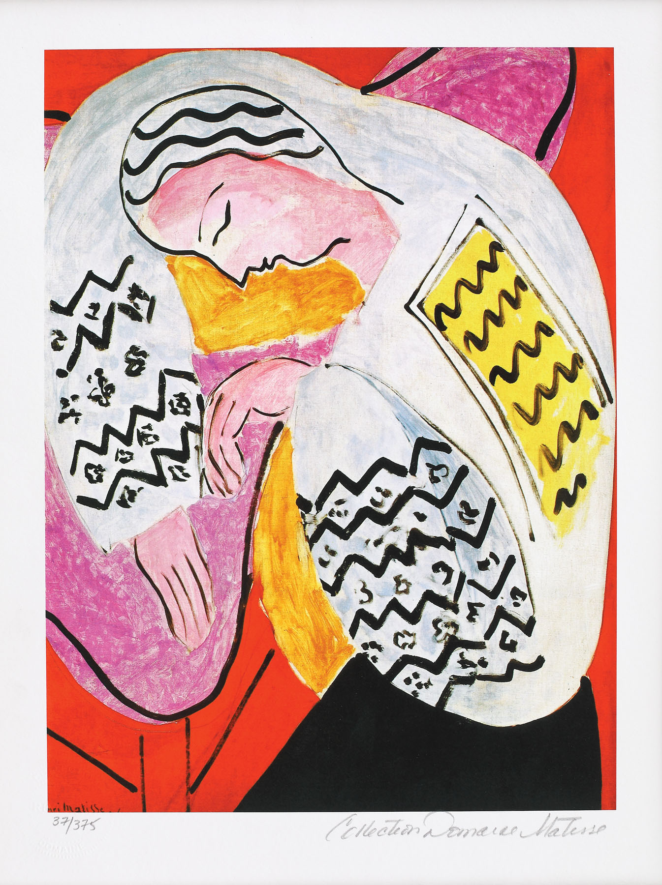 numerotat stânga jos, sub cadru, în creion, "37/375"; stânga jos, ștampila editurii, ”COLLECTION DOMAINE”; notat dreapta jos, sub cadru, în creion, "Collection Domaine Matisse"