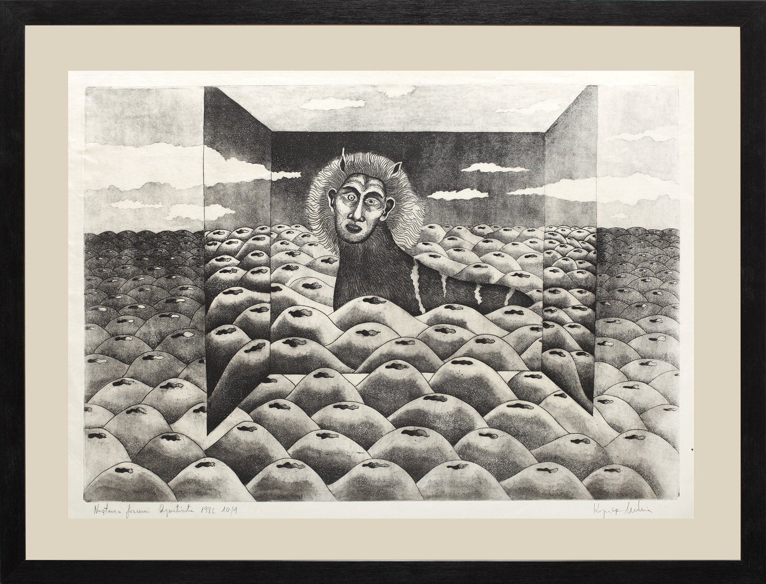 semnat dreapta jos, în creion, Kopacz Maria; intitulat, datat şi numerotat stânga jos, în creion, "Naşterea formei", 10/1, 1982