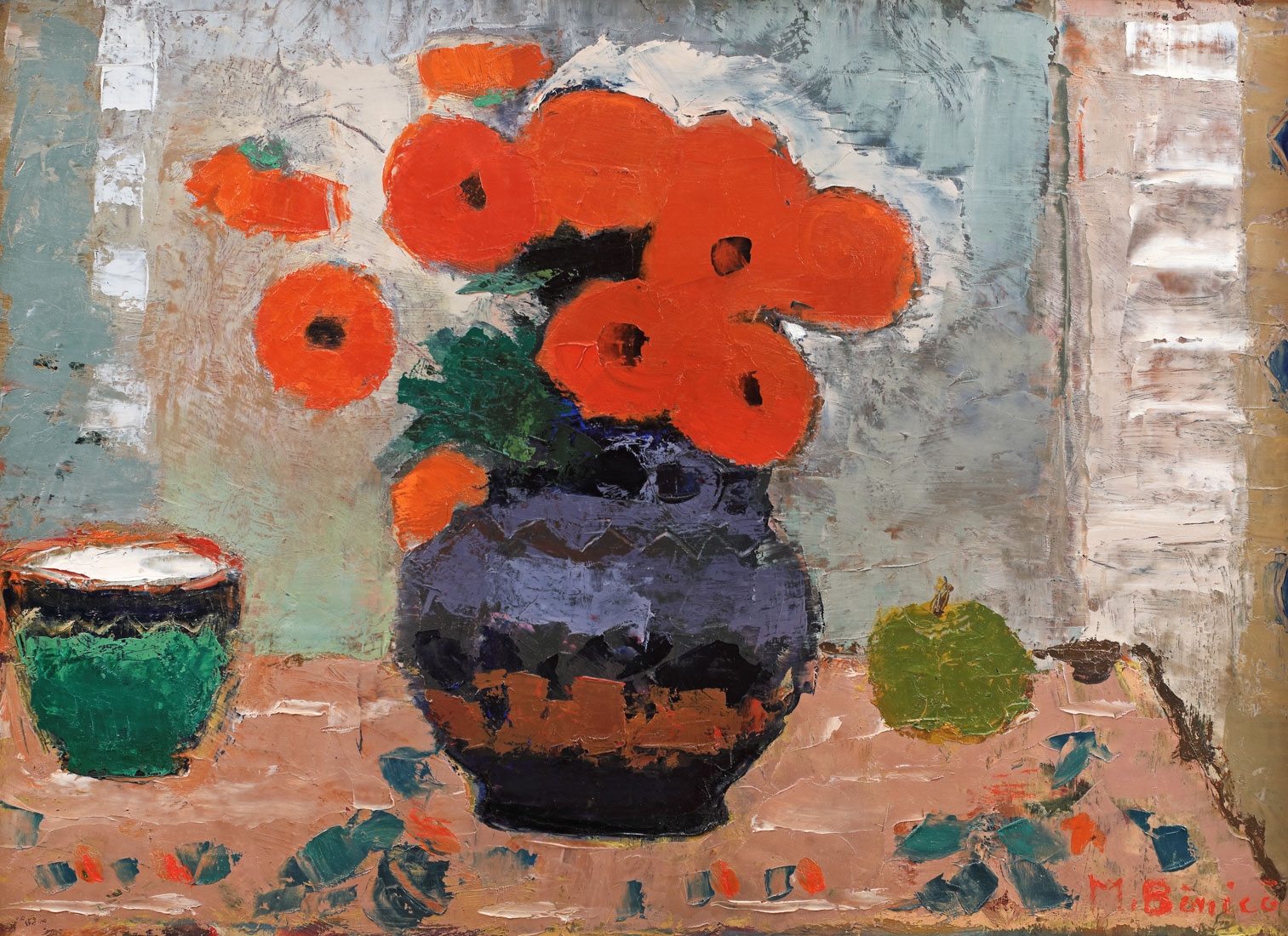 semnat dreapta jos, cu oranj, "M. Bănică"