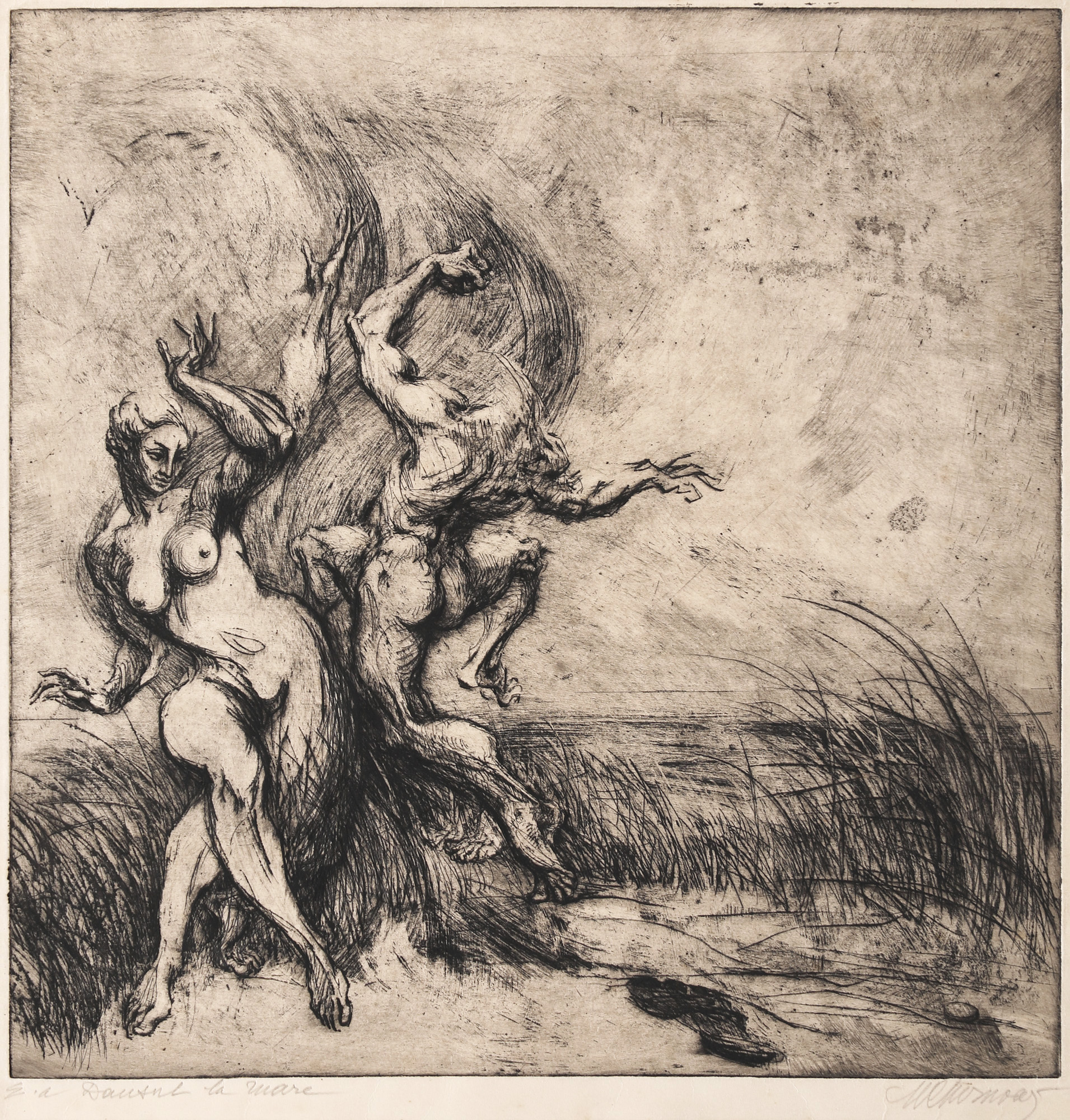semnat dreapta jos, sub cadru, în creion, ”M. Chirnoagă”; notat stânga jos, sub cadru, în creion, ”EA, Dansul la mare”
