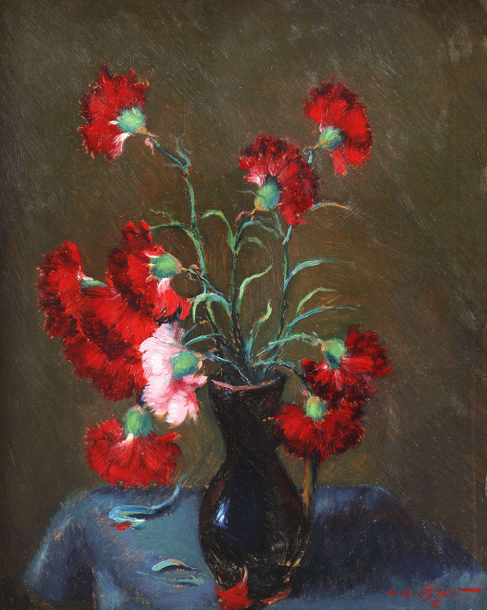 semnat dreapta jos, cu roșu, "L.A. Biju"