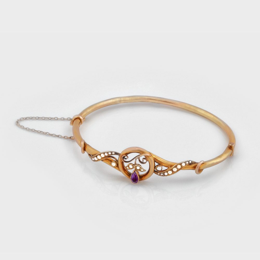227. Brăţară Art Nouveau din aur, decorată cu ametist-lacrimă şi perle
