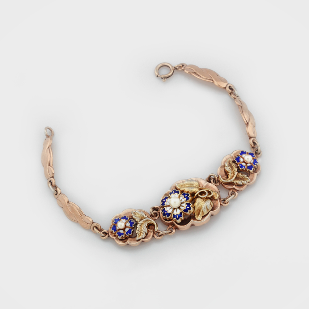 Brățară compusă din șapte segmente, presate, trei dintre ele diferite, decorate cu motive florale, emailate cloisonne simplu, cu perlă, închizătoare tip springring.