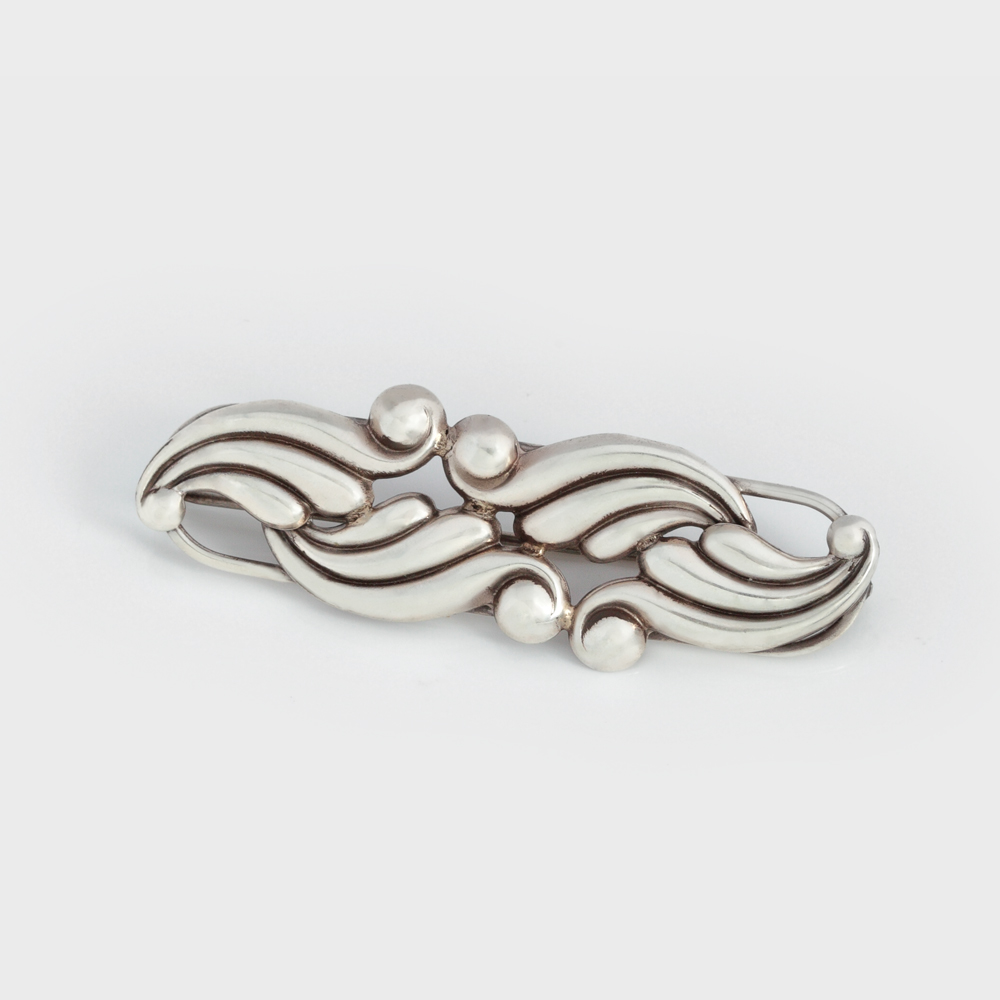 Broșă cu design danez, pentru colecționarii de piese Georg Jensen, cizelată manual cu elemente vegetale stilizate în manieră Art Nouveau.