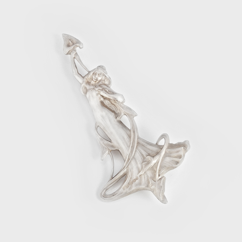 Broşă din argint reprezentând un personaj feminin cu flori de cală, ac de prindere, stil art-nouveau.