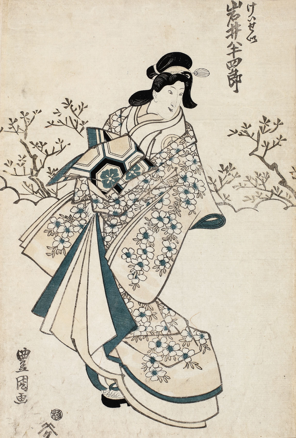 Gravura semnată de Utagawa Toyokuni I îl înfățișează pe actorul kabuki Iwai Hanshirō V (1776 – 1847) în rolul unei curtezane. Elegantul său kimono, decorat cu flori, sugerează că acțiunea din spectacol se petrece în timpul primăverii. Maniera de înfățișare a figurii umane, specifică lui Toyokuni I, a devenit ulterior o marcă specifică pentru gravura școlii Utagawa.
