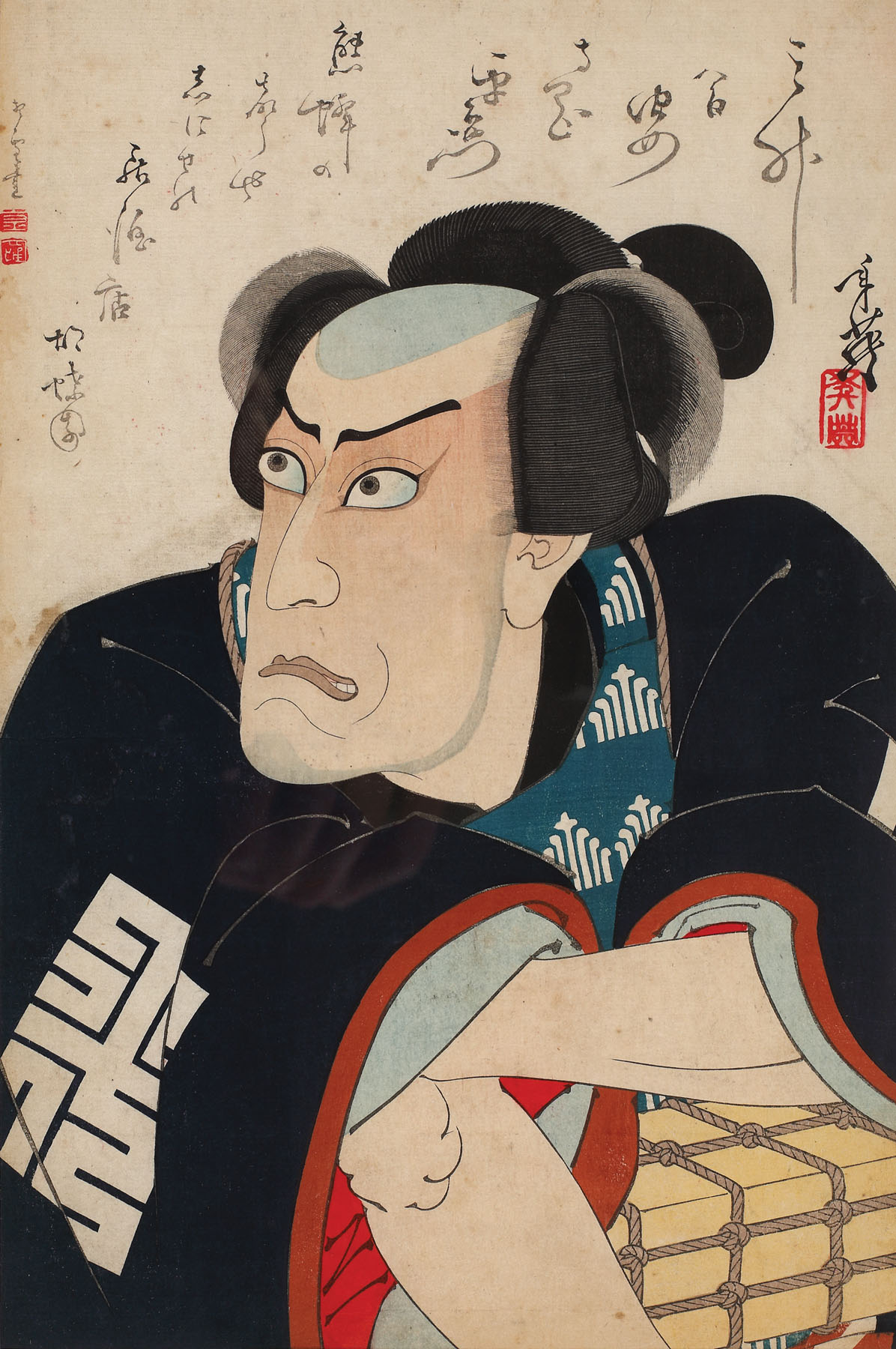 Gravura, semnată de Toshihide Migita, îl înfățișează pe Ichikawa Danjuro IX (1838 – 1903), cel mai popular actor de teatru kabuki, de la sfârșitul secolului al XIX-lea. Portretul, realizat de artist într-o manieră modernă dar care amintește de marea tradiție a xilogravurii ukiyo-e din perioada Edo, exprimă dramatism și totodată exuberanță.