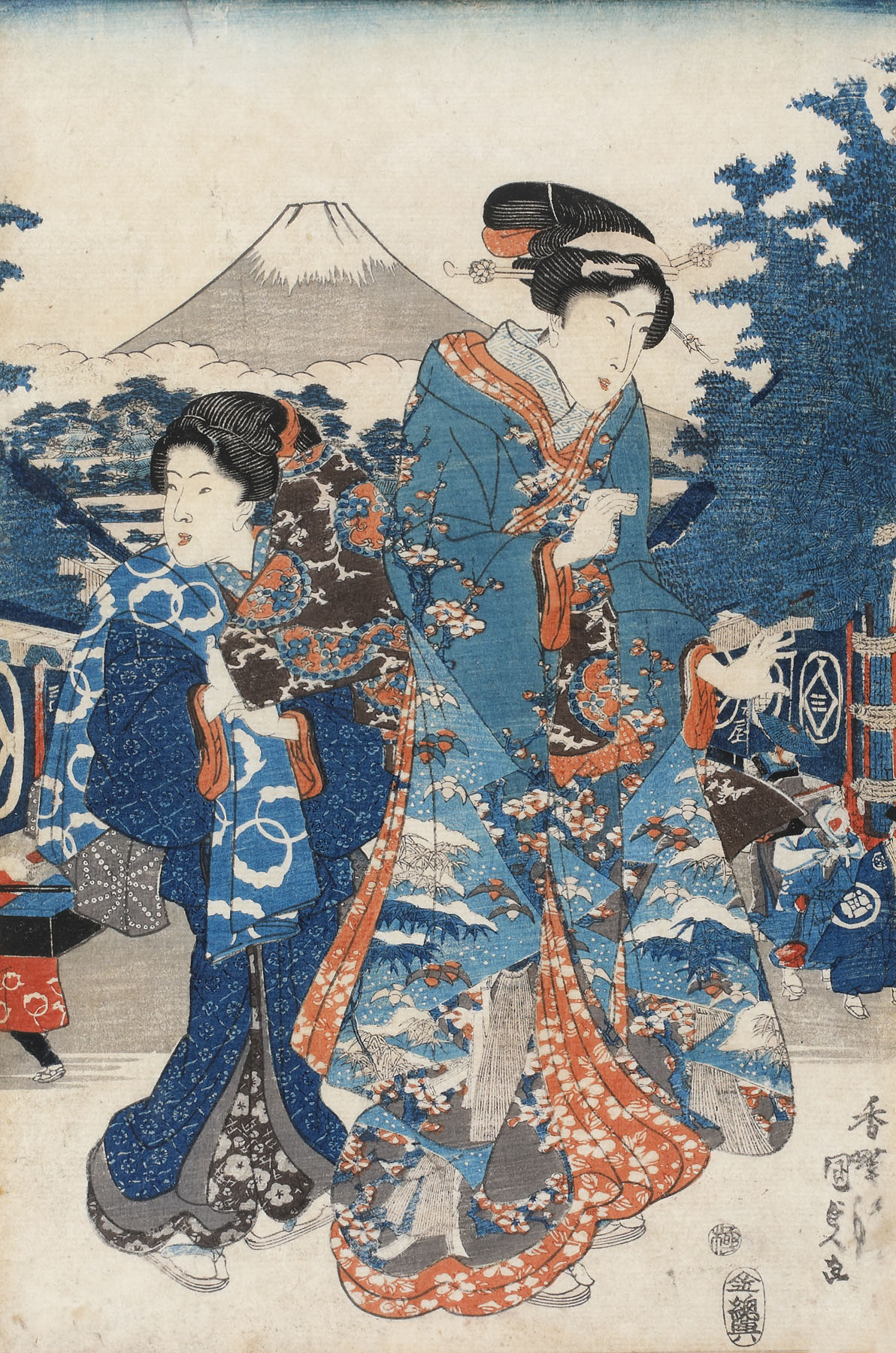 99. Gheișe la plimbare, pe fundal muntele Fuji înzăpezit [cca. 1840]