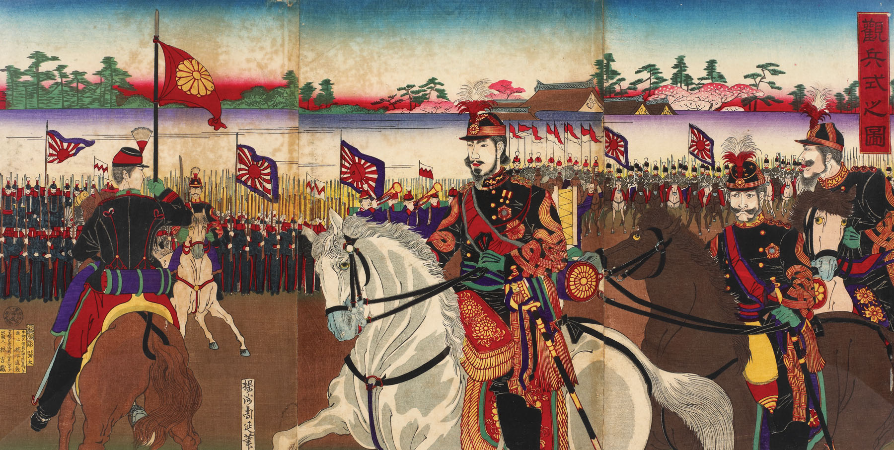 118. Împăratul Meiji și ofițerii lui la trecerea în revistă a trupelor [1887]