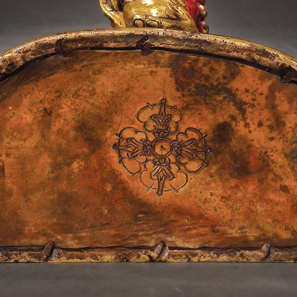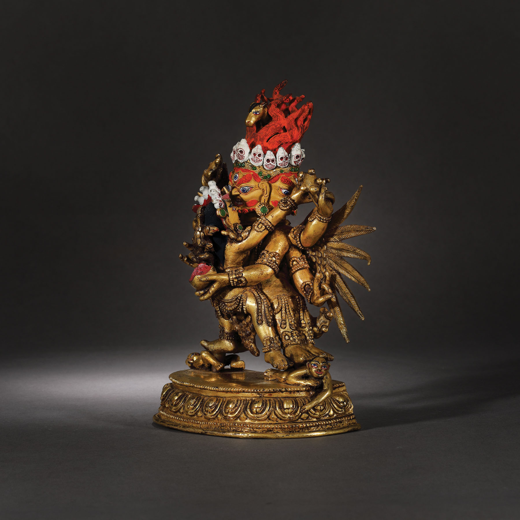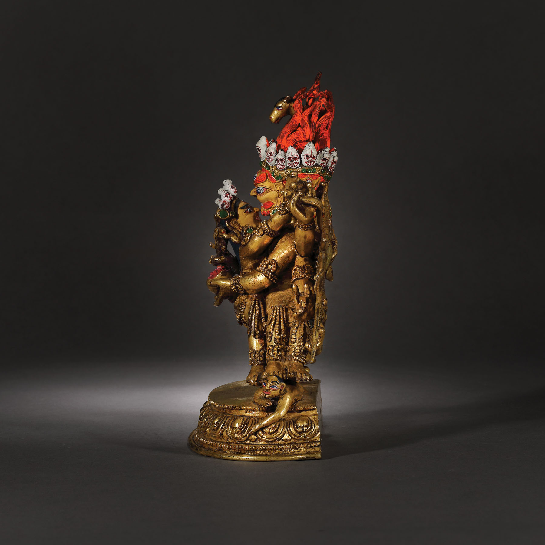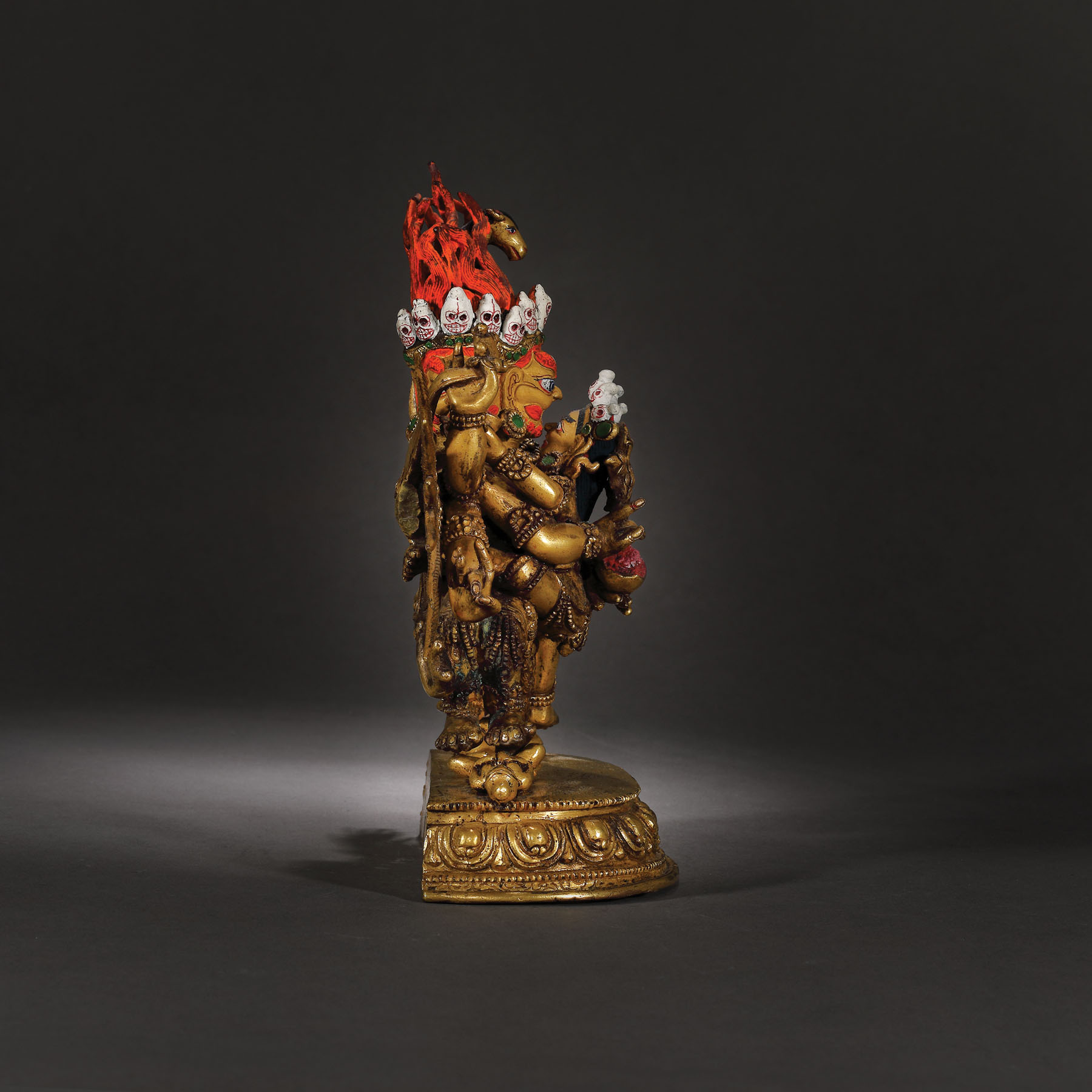 Această statuetă impresionantă este printre cele mai importante obiecte aparținând spațiului sino-tibetan care apare pe piața românească. Dimensiunea și nivelul extraordinar de detaliat sugerează faptul că a fost produsă într-un atelier specializat din secolul al XVIII-lea, o perioadă de schimb cultural extins și eflorescență religioasă în China dinastiei Qing. Deitatea magnifică, amenințătoare, este așezată în poziția ”alidhasana” pe două figuri prostrate, peste o bază dublă de lotus. Poartă un veșmânt tradițional cu mărgele și este împodobit cu diverse bijuterii, panglici și o ghirlandă cu cranii decupate.