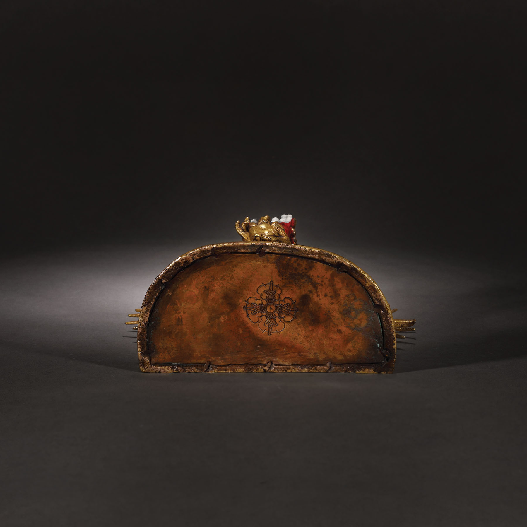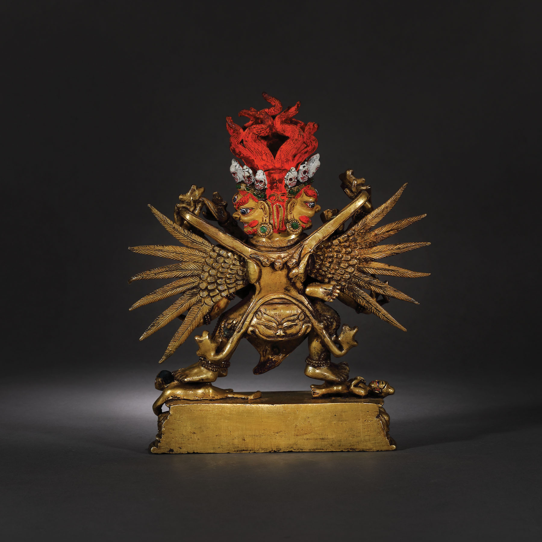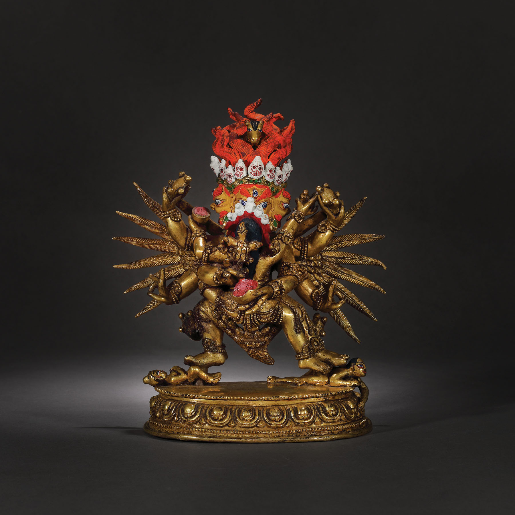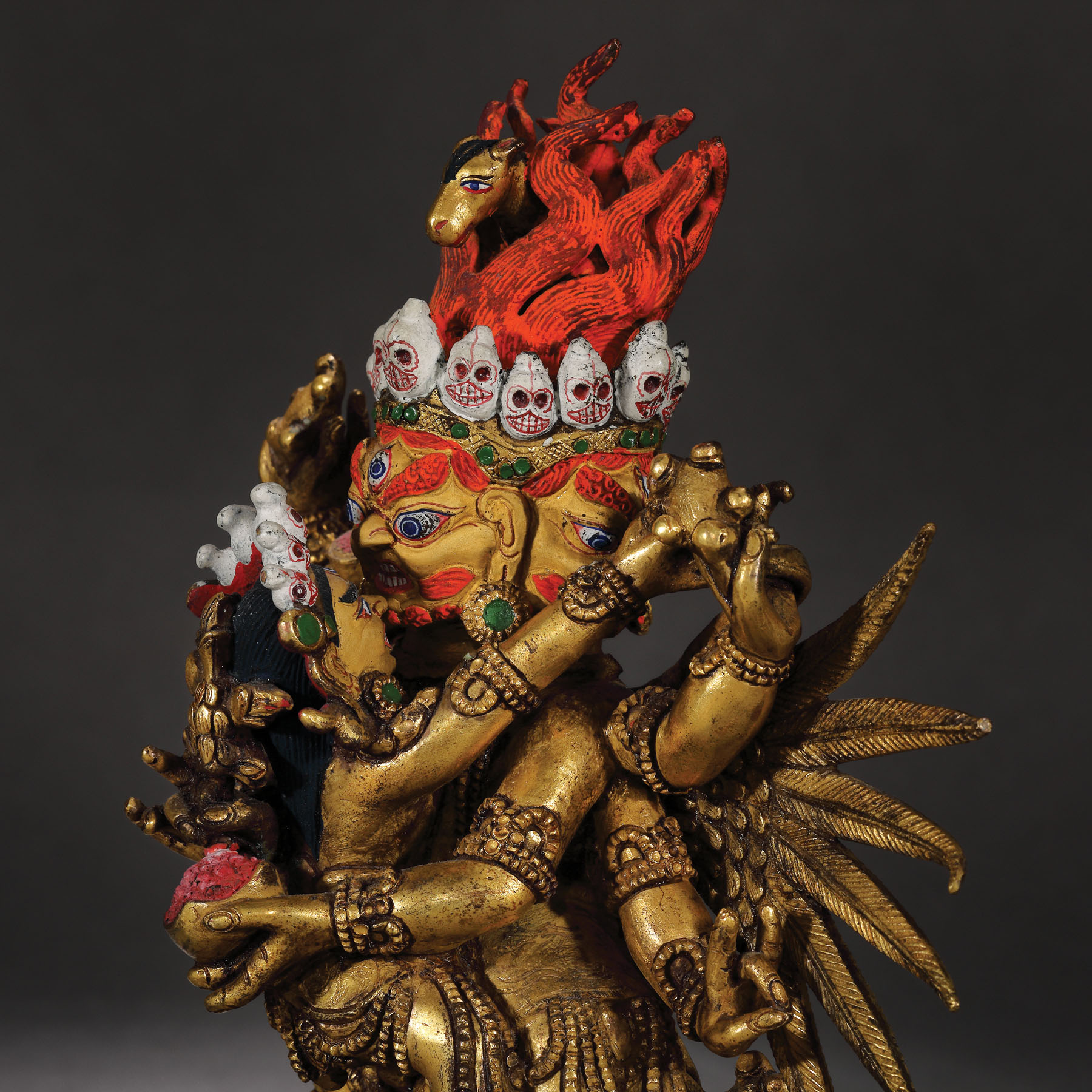 Această statuetă impresionantă este printre cele mai importante obiecte aparținând spațiului sino-tibetan care apare pe piața românească. Dimensiunea și nivelul extraordinar de detaliat sugerează faptul că a fost produsă într-un atelier specializat din secolul al XVIII-lea, o perioadă de schimb cultural extins și eflorescență religioasă în China dinastiei Qing. Deitatea magnifică, amenințătoare, este așezată în poziția ”alidhasana” pe două figuri prostrate, peste o bază dublă de lotus. Poartă un veșmânt tradițional cu mărgele și este împodobit cu diverse bijuterii, panglici și o ghirlandă cu cranii decupate.