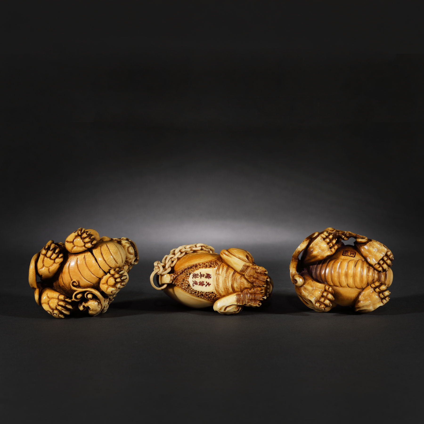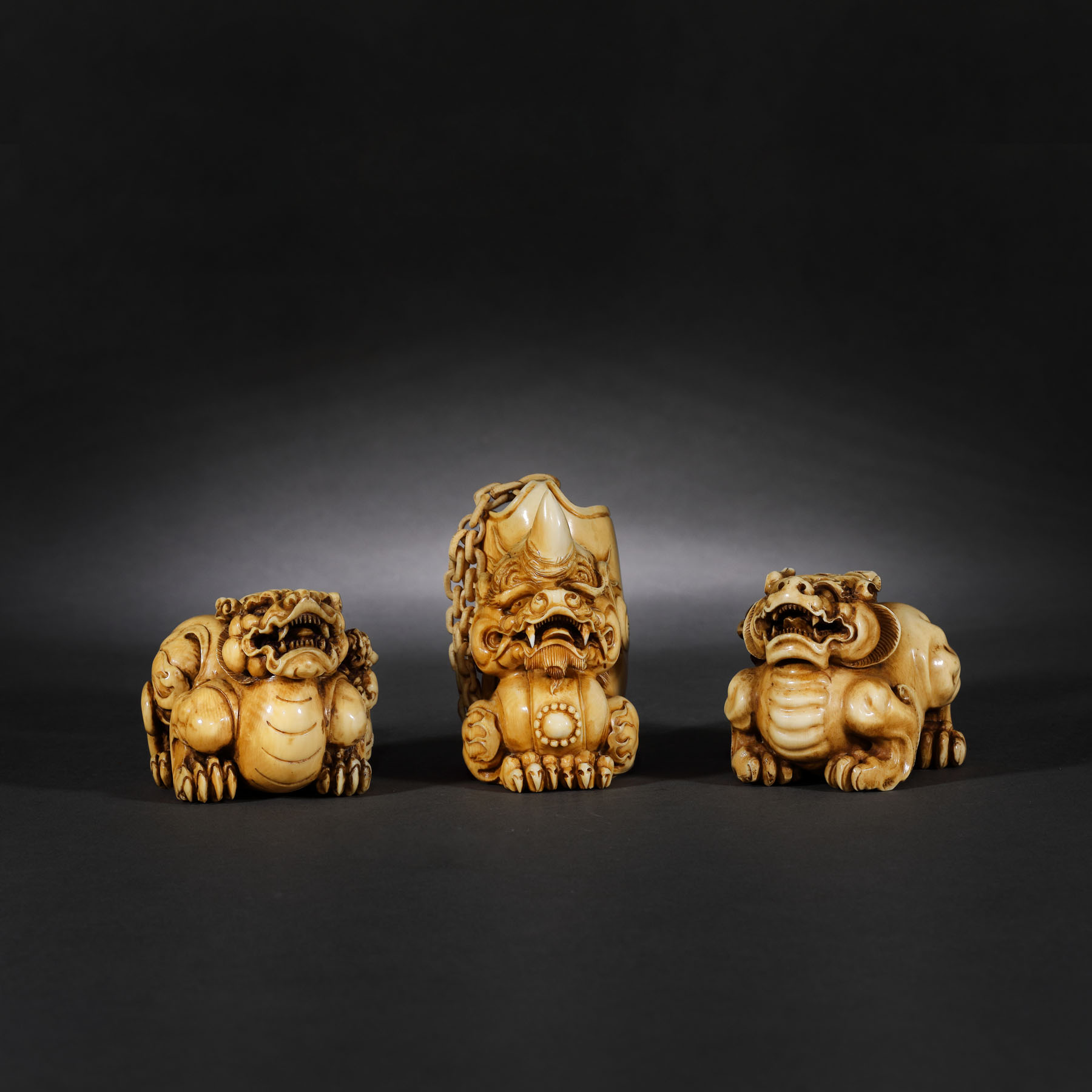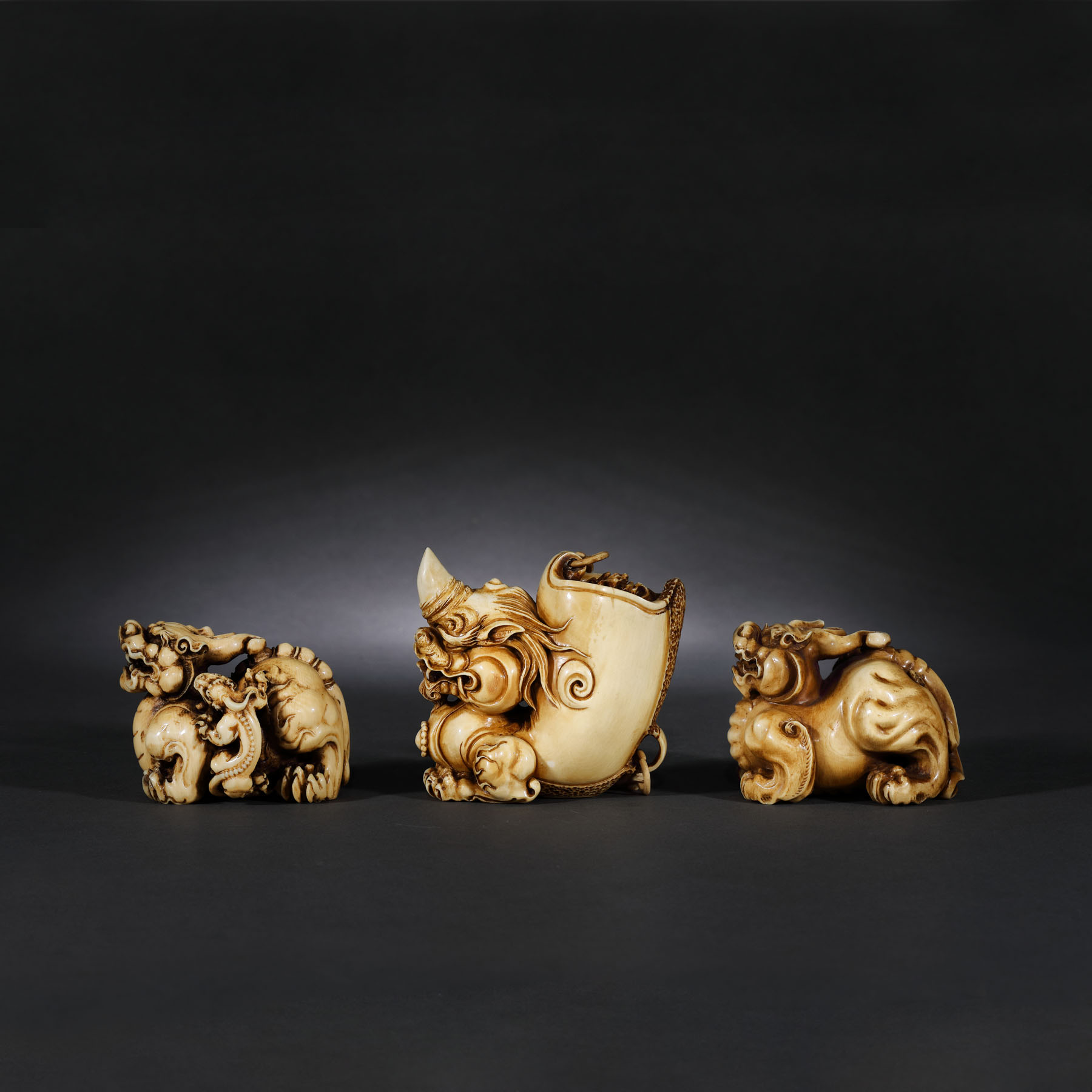 102. Lot format din trei figurine din fildeș de mamut, ilustrând dragoni Chilong, perioada dinastiei Qing, China, sec. XIX