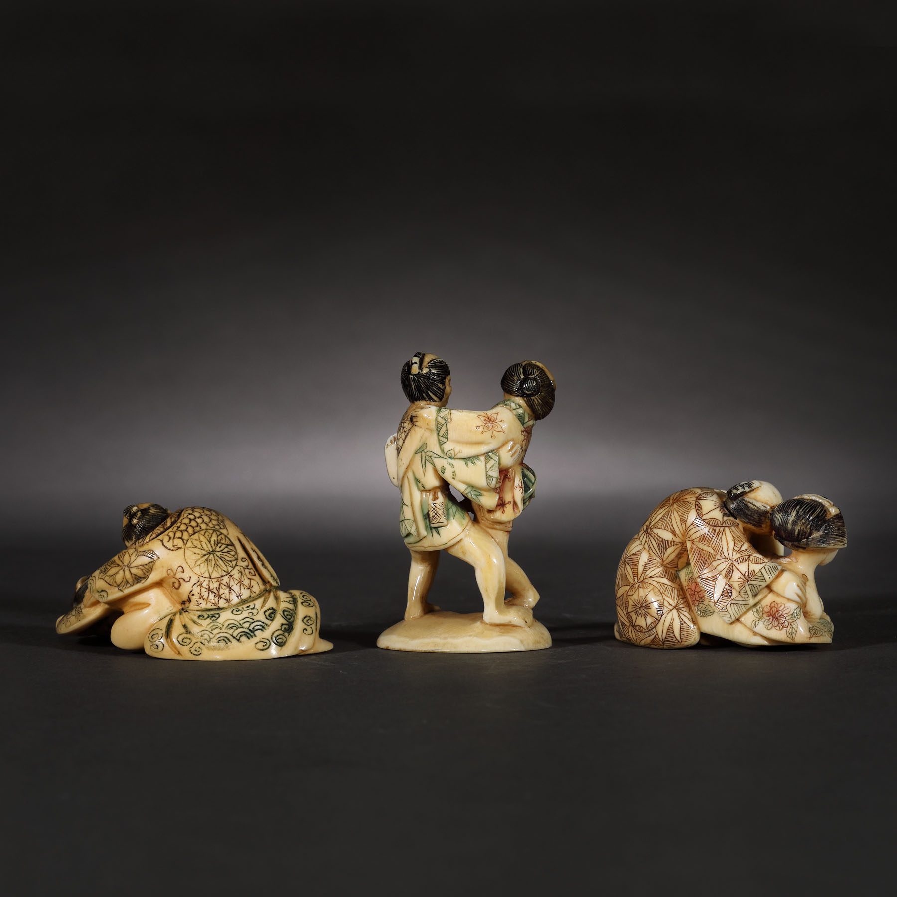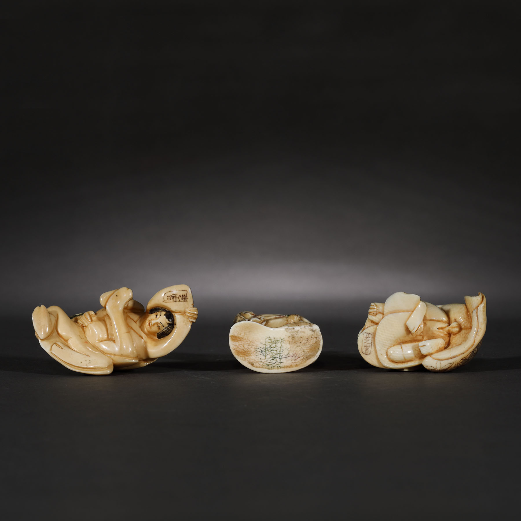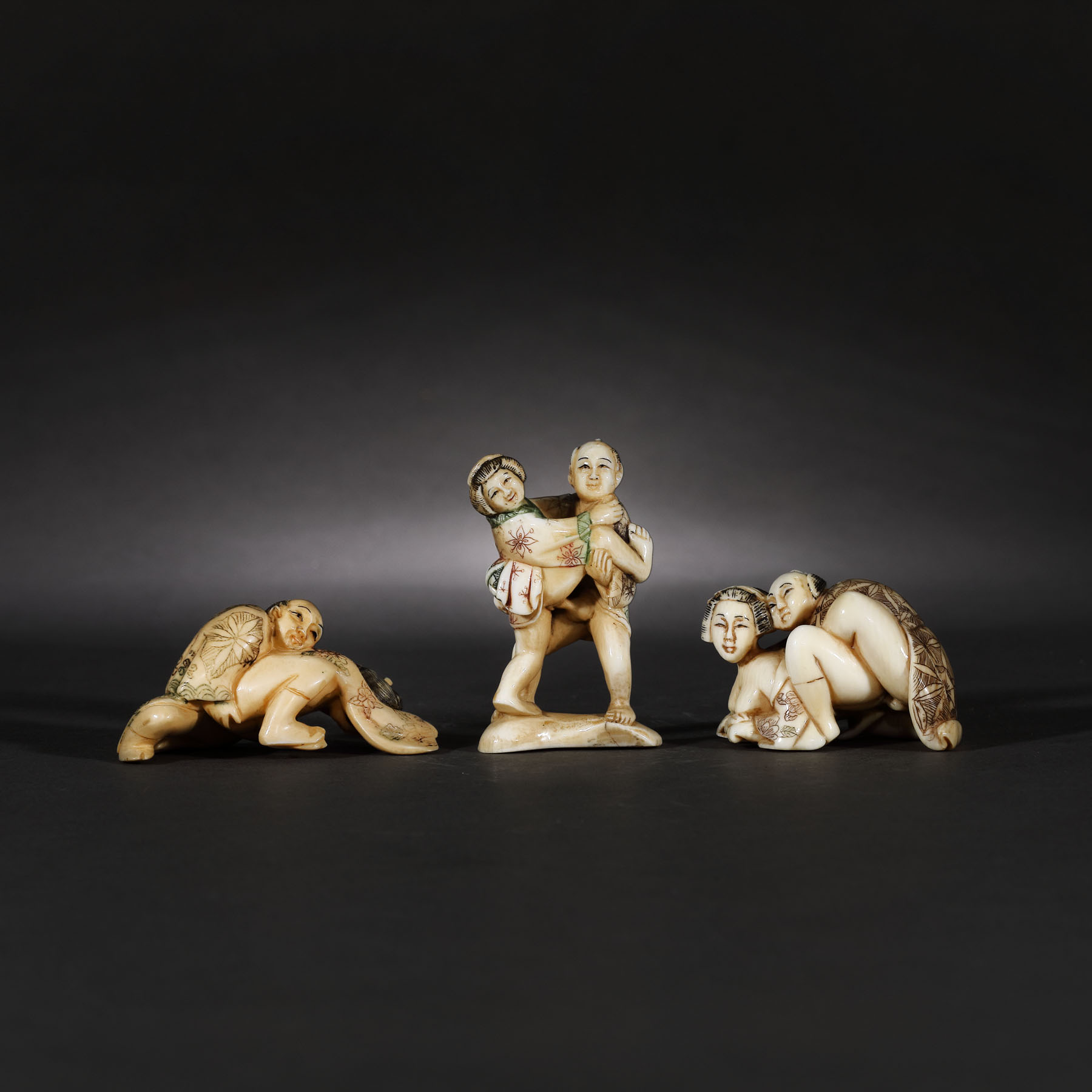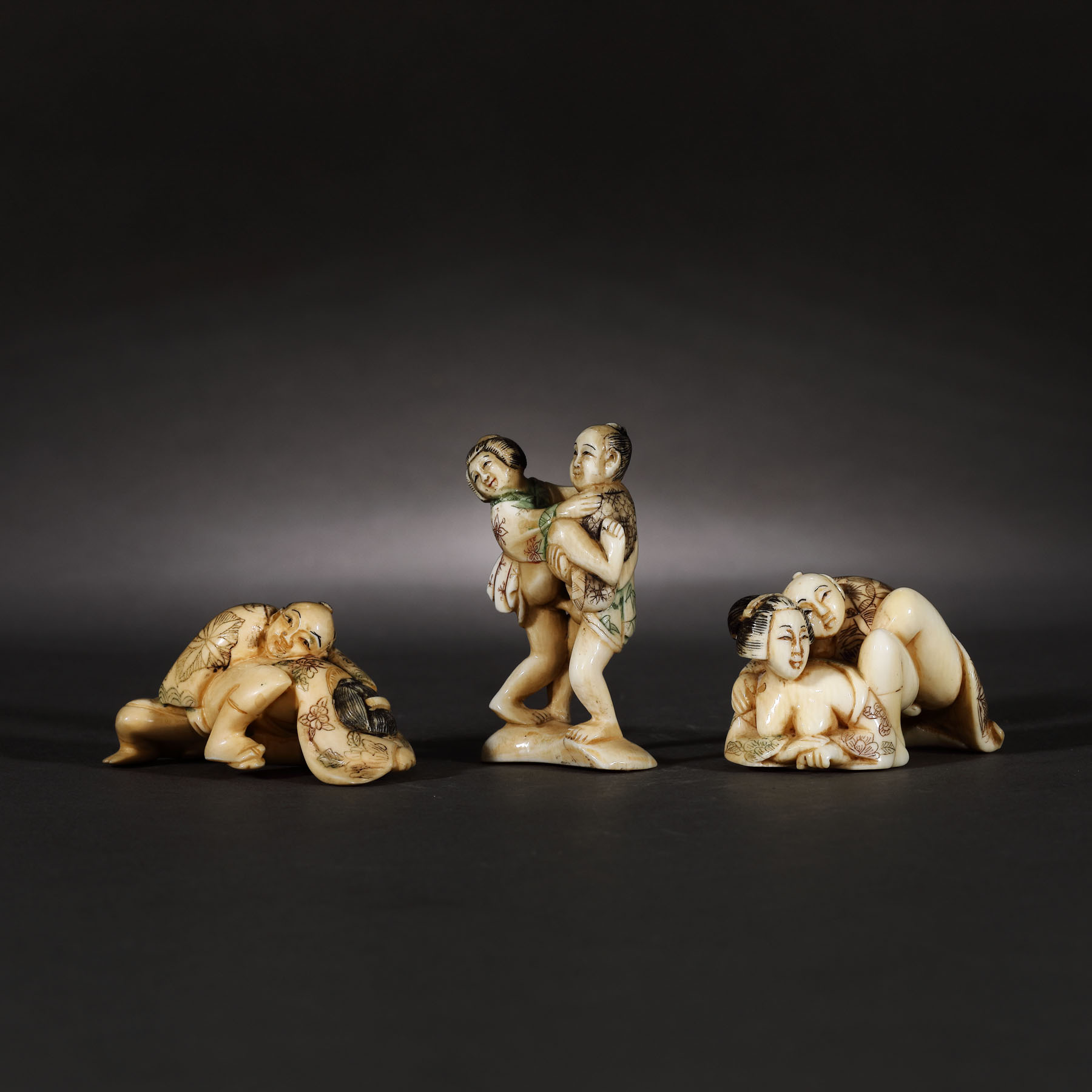 80. Lot format din trei figurine netsuke erotice, din fildeș, semnate Okanobu, perioada Edo, Japonia, începutul sec. XIX