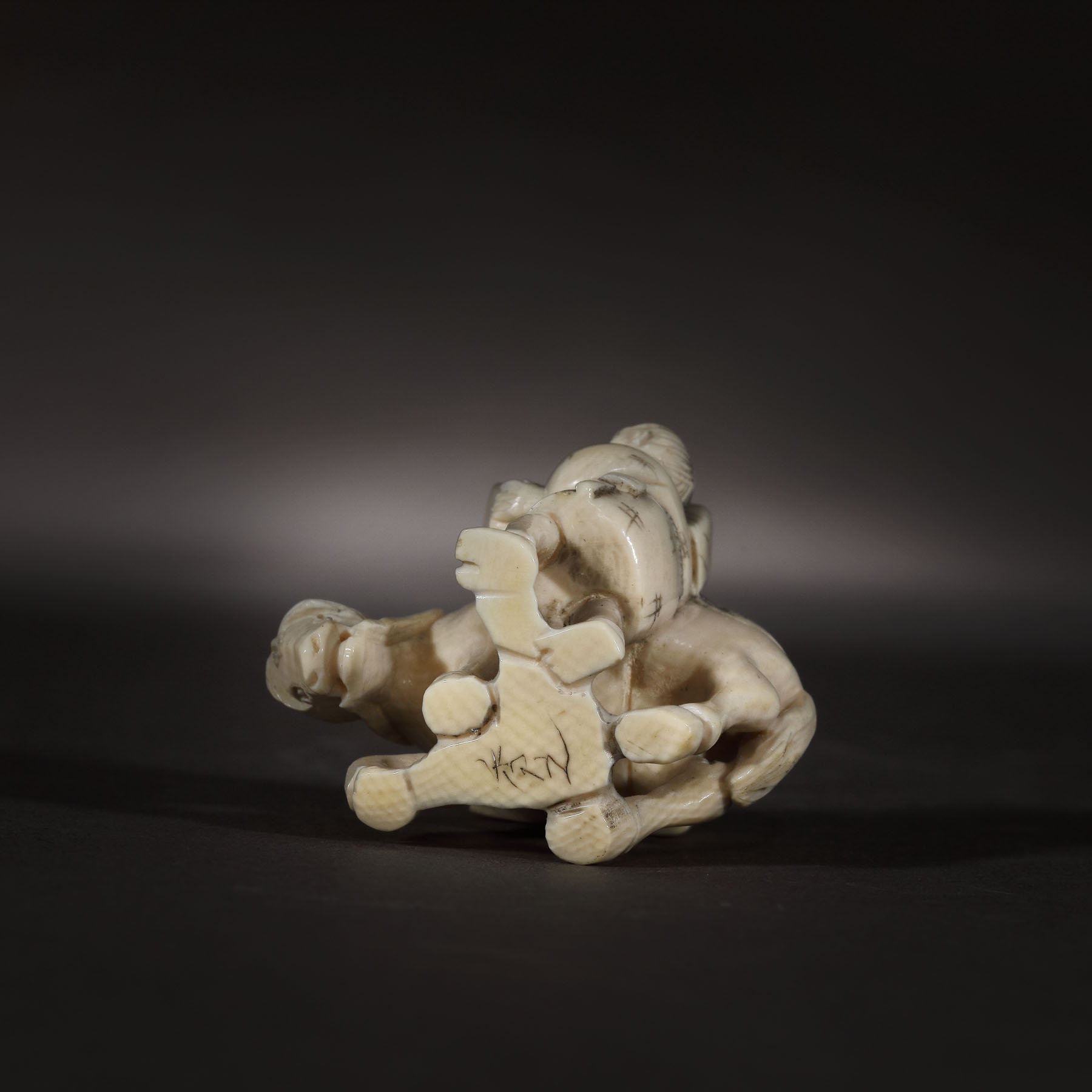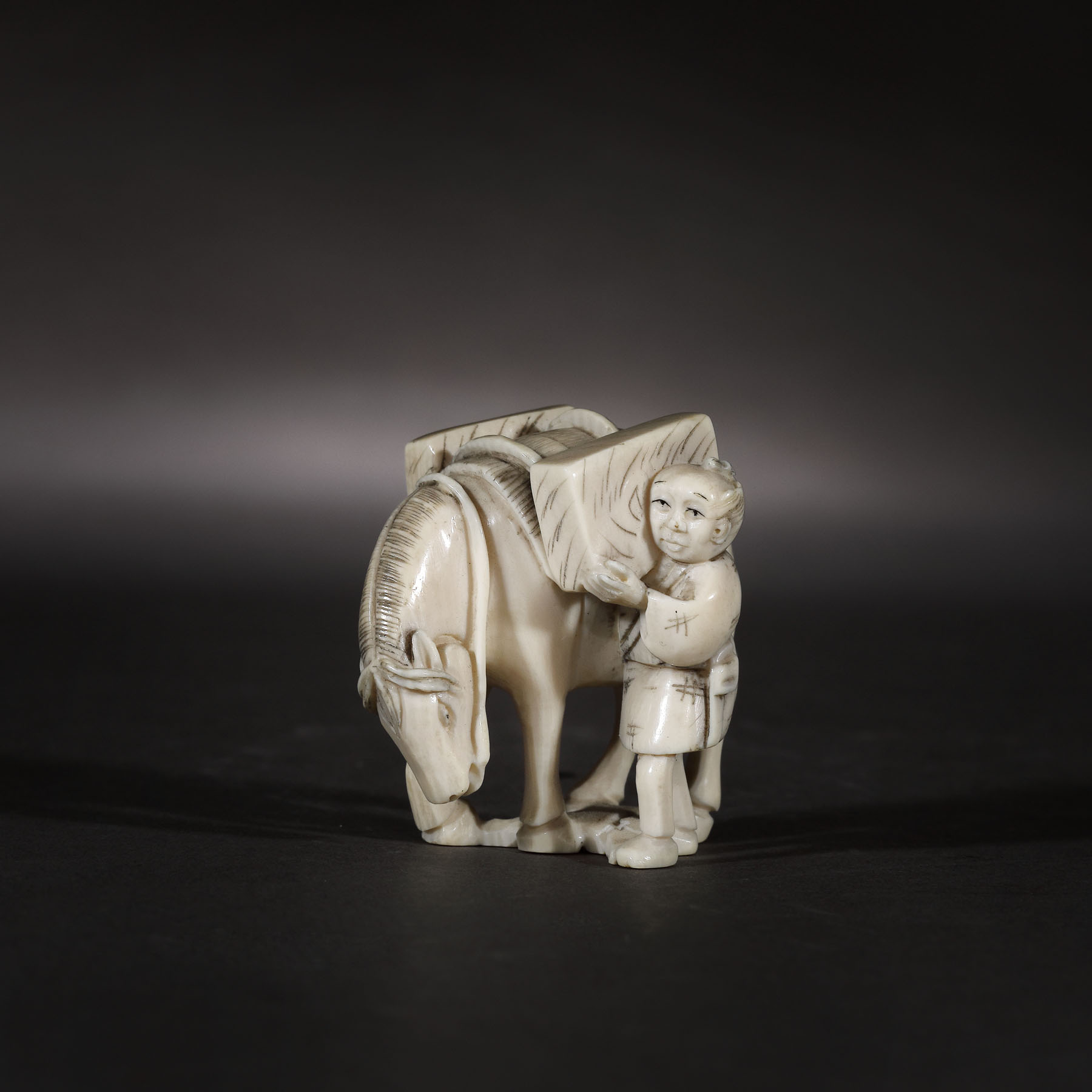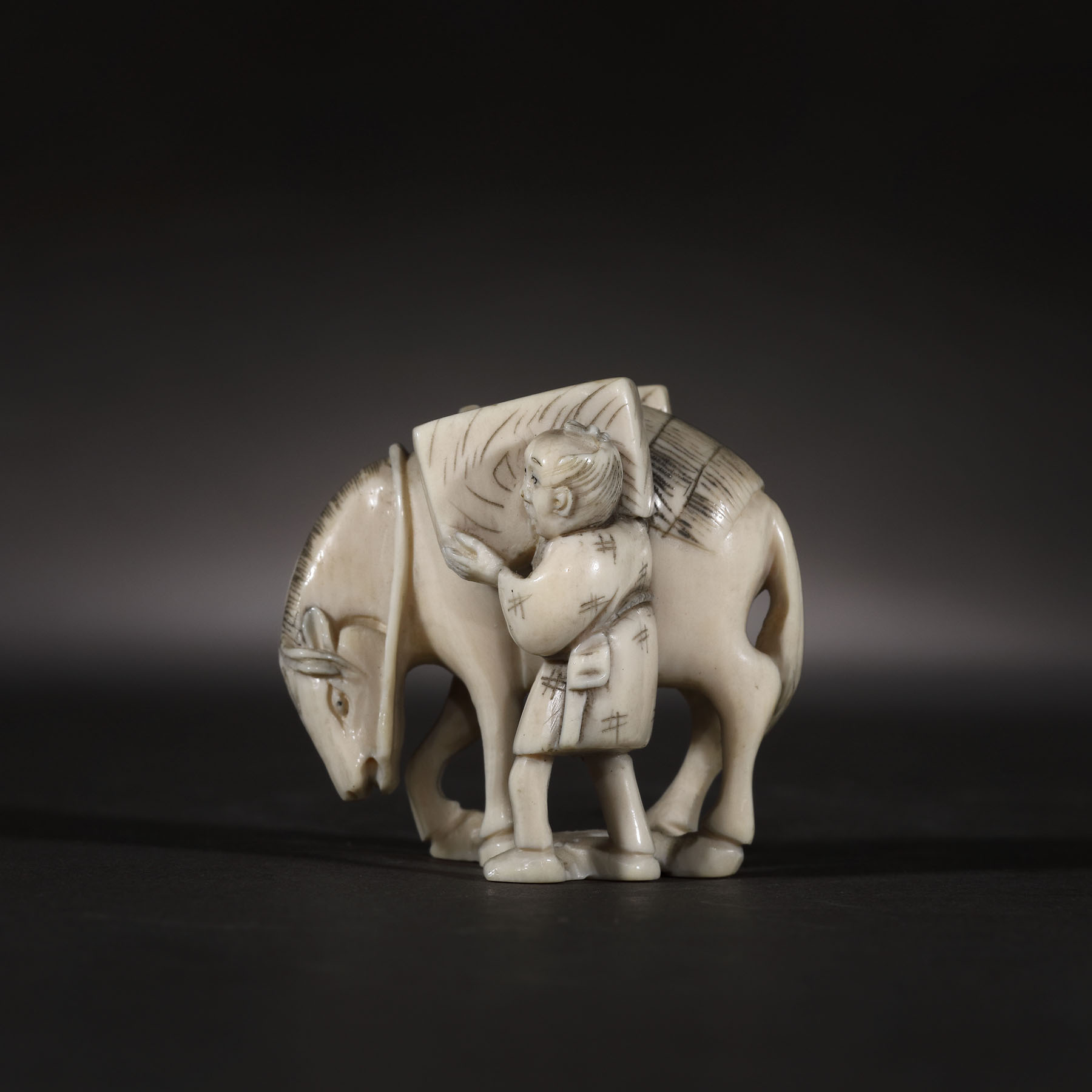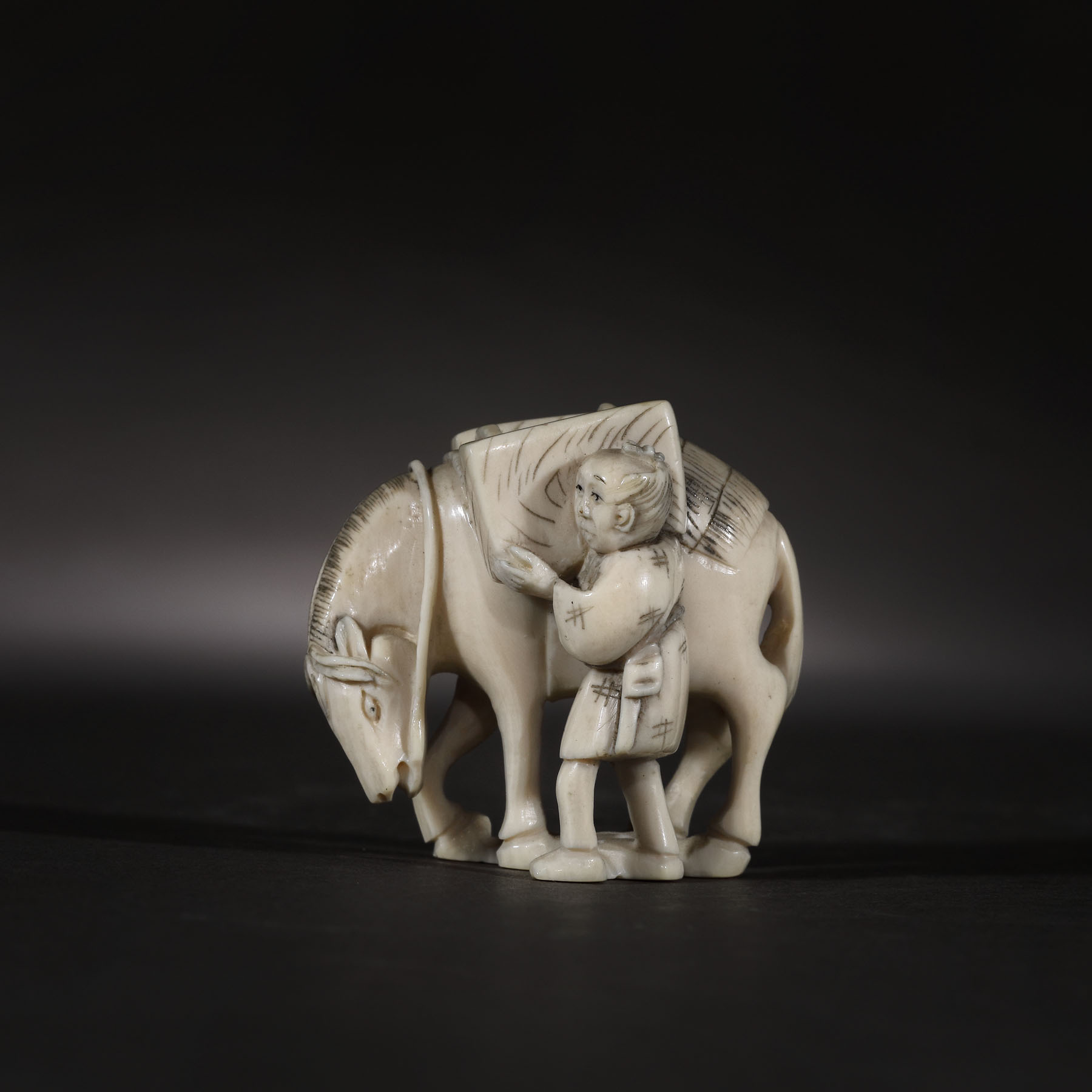 73. Netsuke din fildeș, ilustrând un cărăuș și calul său, semnat Hideyuki, perioada Meiji, Japonia, cca. 1900