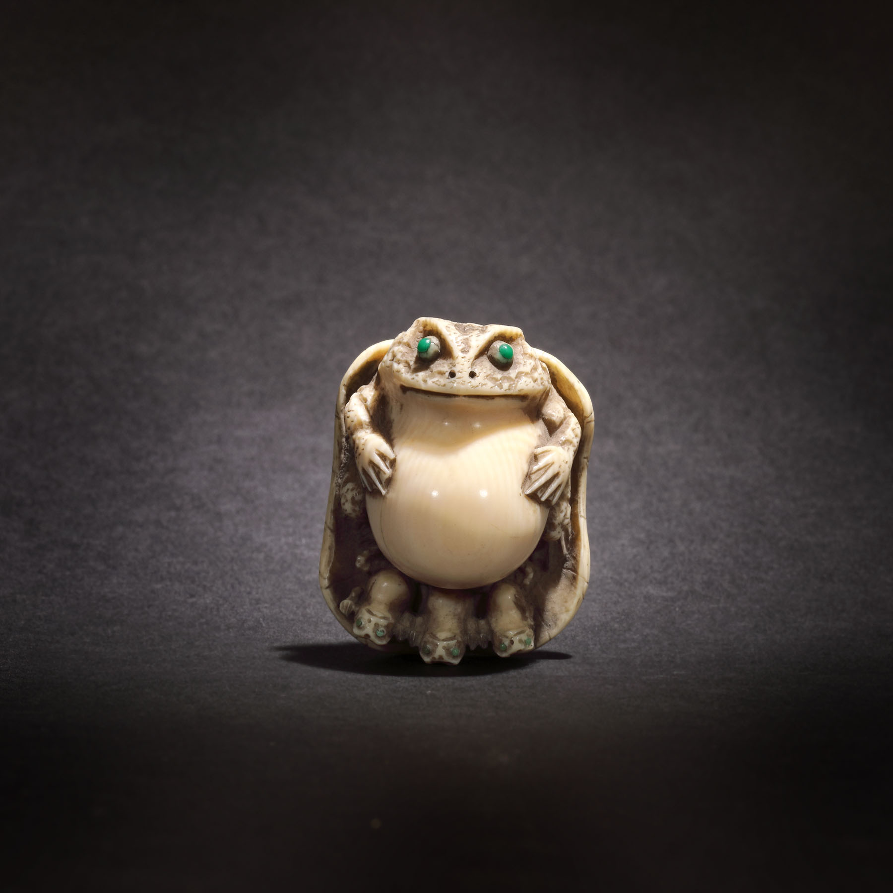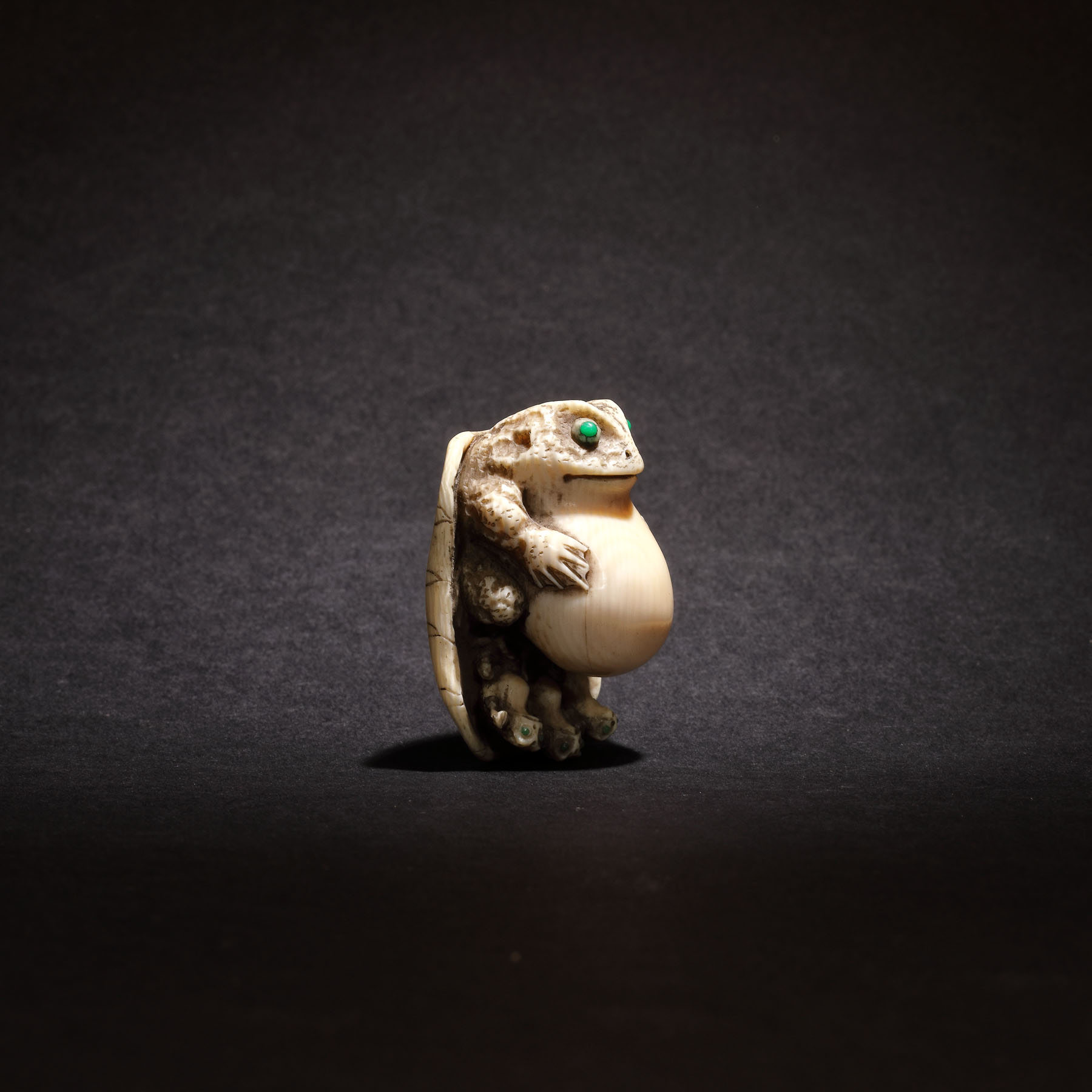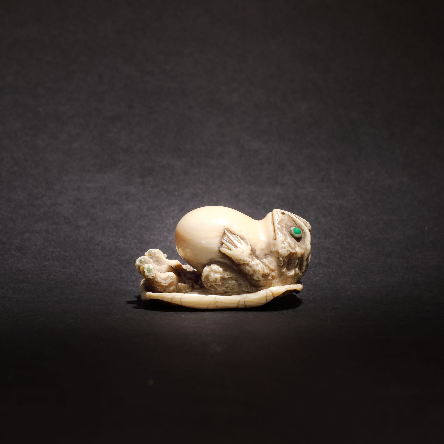 69. Netsuke din fildeș reprezentând o broască cu pui pe o frunză, semnat Tomokazu, perioada Edo, Japonia, sec. XIX
