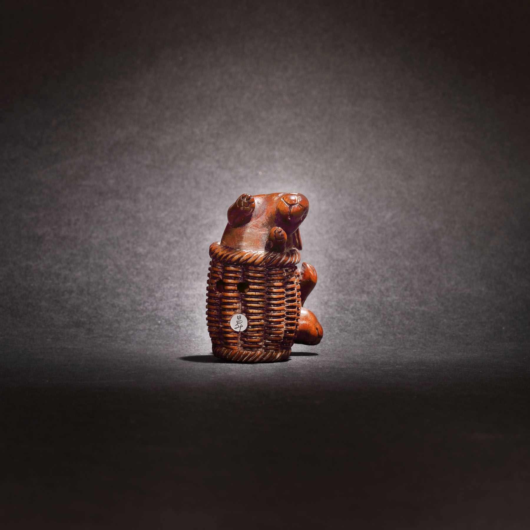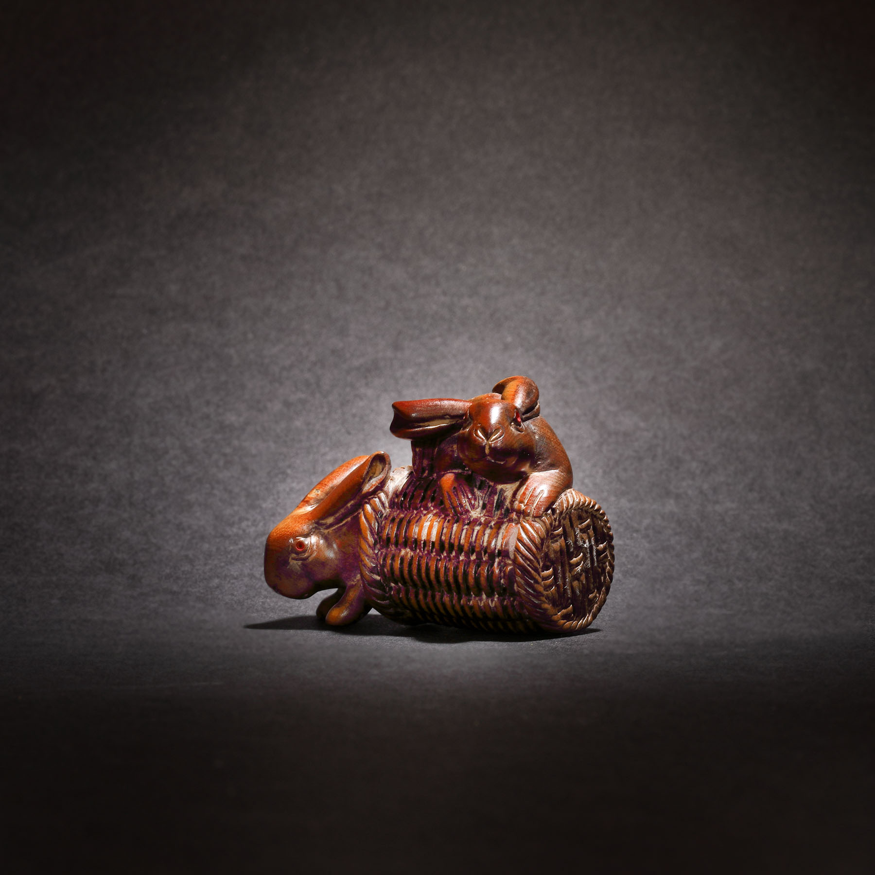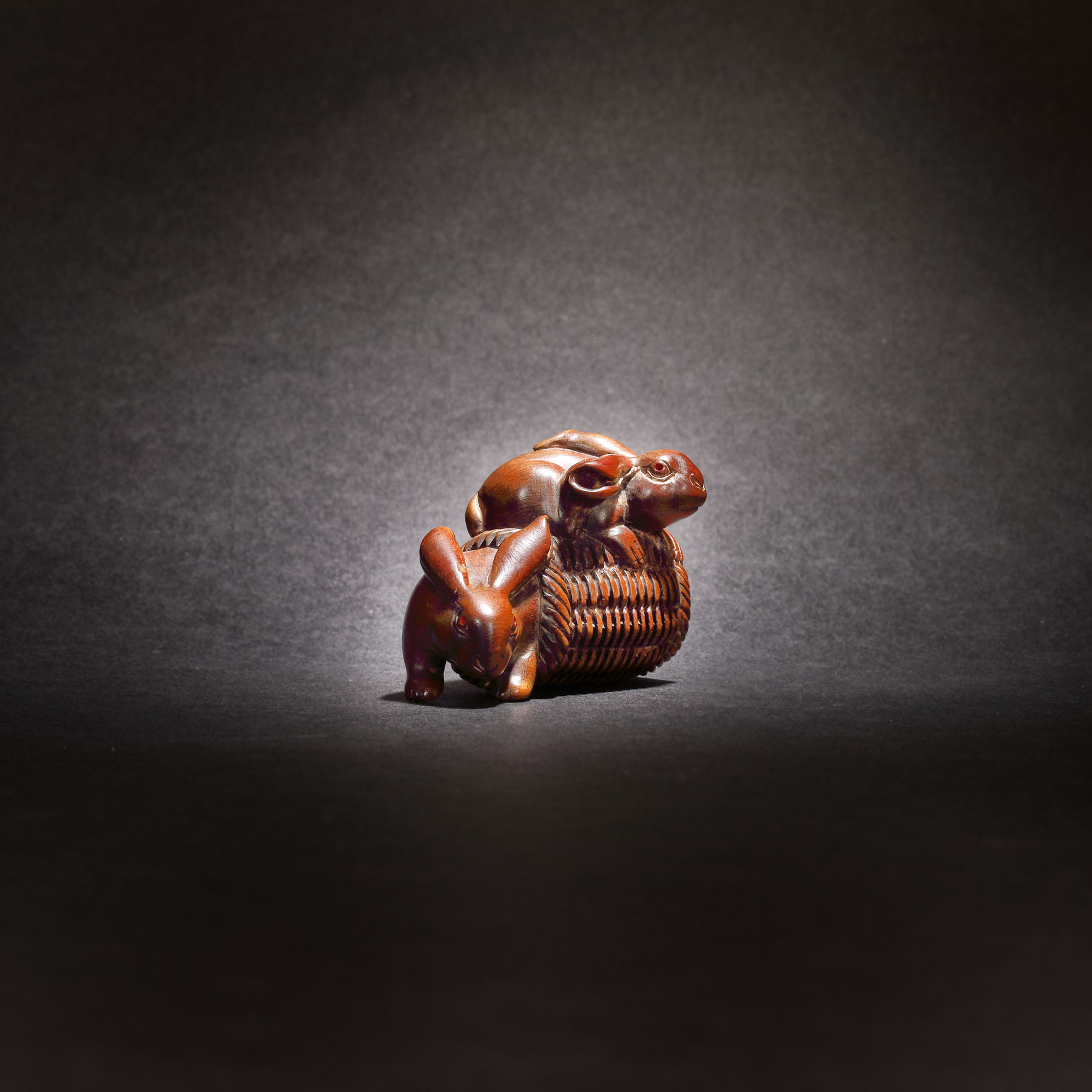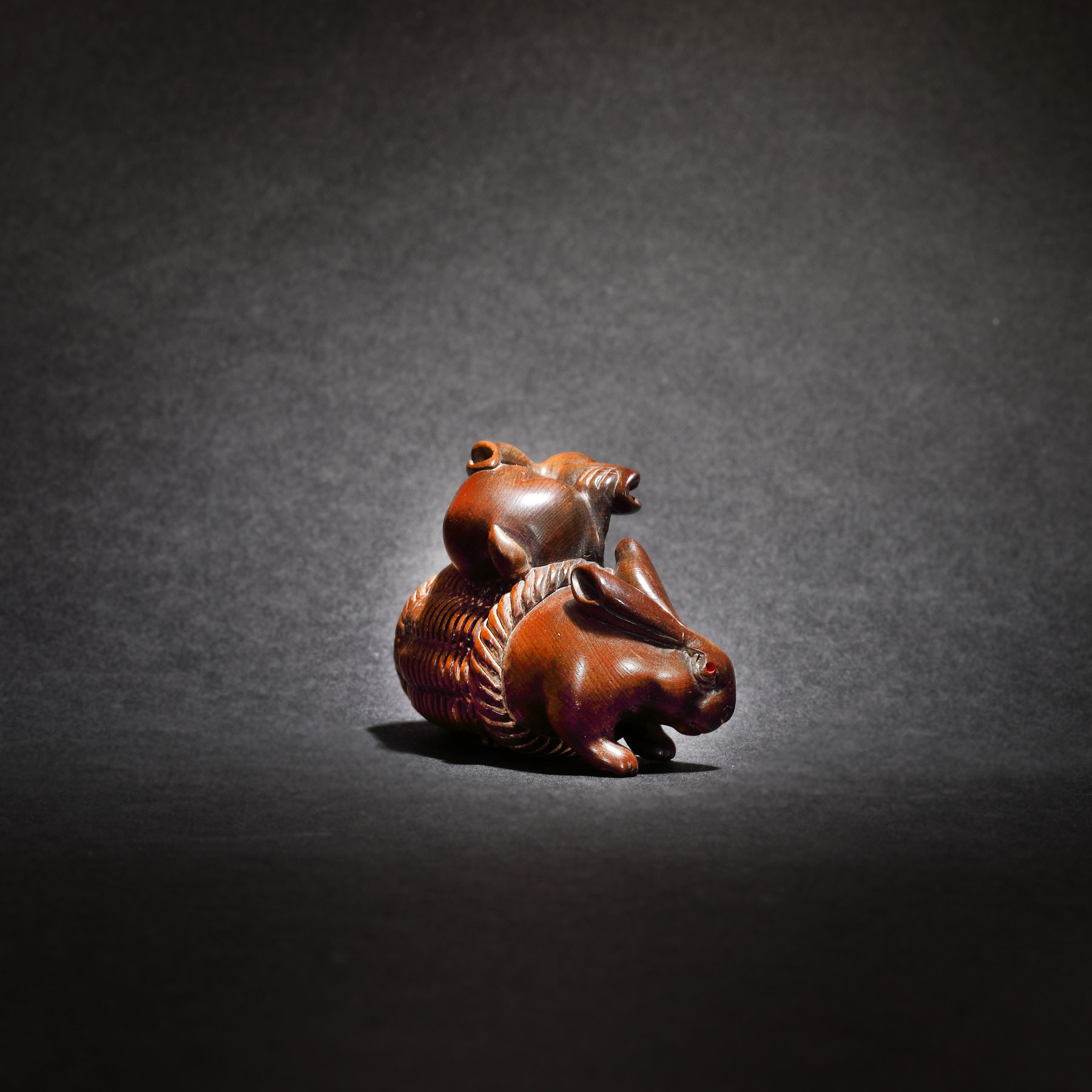 48. Netsuke din lemn, reprezentând doi iepuri, semnat Nissho, perioada Meiji, Japonia, sec. XIX