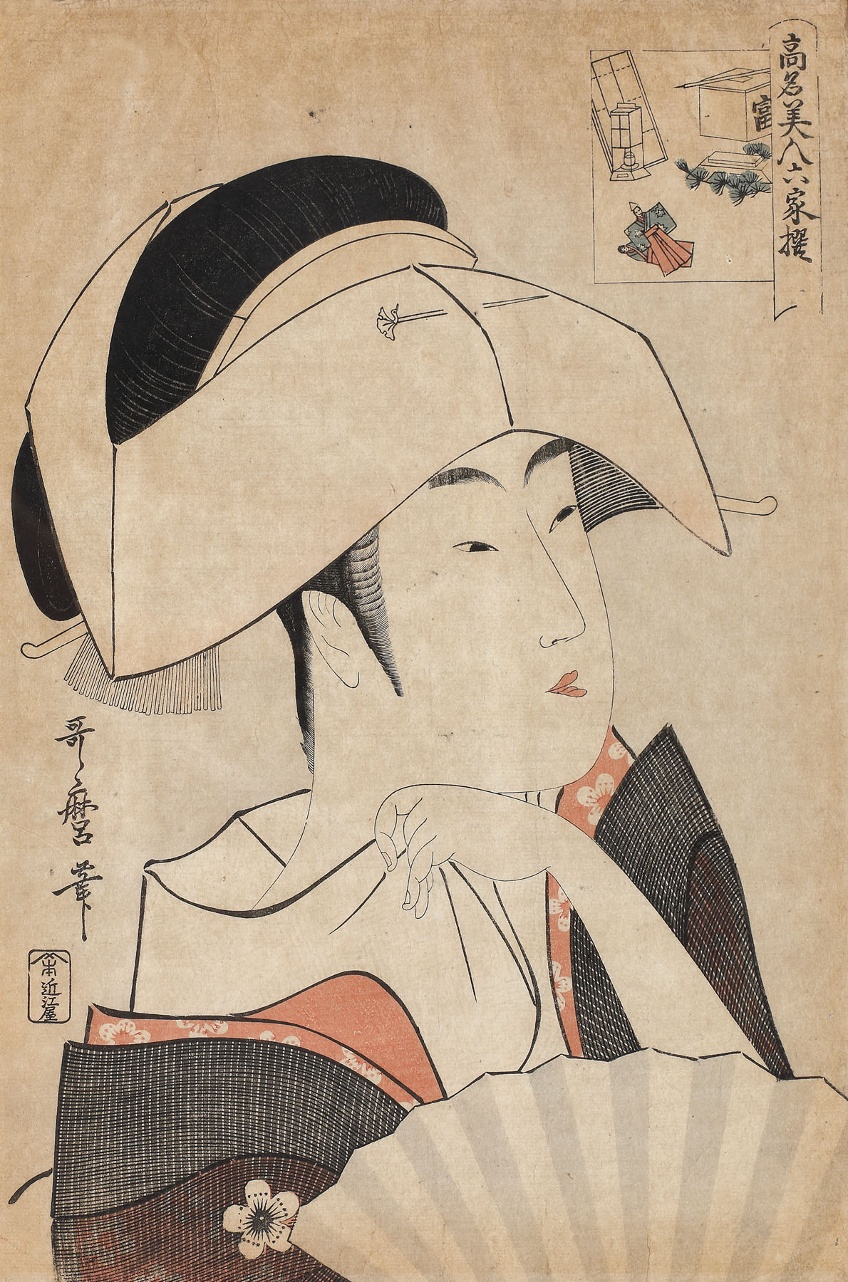 Reprezentarea femeii a fost una dintre cele mai importante teme ale artei din genul ukiyo-e (lit. imagini ale lumii plutitoare) pe tot parcursul perioadei Edo (1603-1868). Stampa lui Utamaro o înfățișează pe gheișa Tomimoto Toyohina, vestită la sfârșitul secolului al XVIII-lea pentru frumusețe și pentru muzica pe care o cânta la shamisen. Artistul a ales să o redea bust, într-o formulă care a devenit marca sa specifică, cu un evantai în mână și cu o elegantă coafură, acoperită cu o pânză de mătasă (agebōshi), un accesoriu menit să o protejeze de praf și de vânt. Lucrarea face parte dintr-o remarcabilă serie de șase gravuri, care surprind portretele unor renumite femei frumoase din Edo.